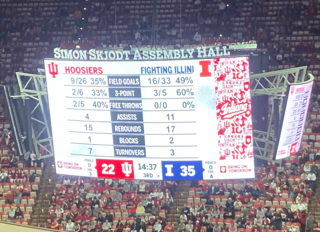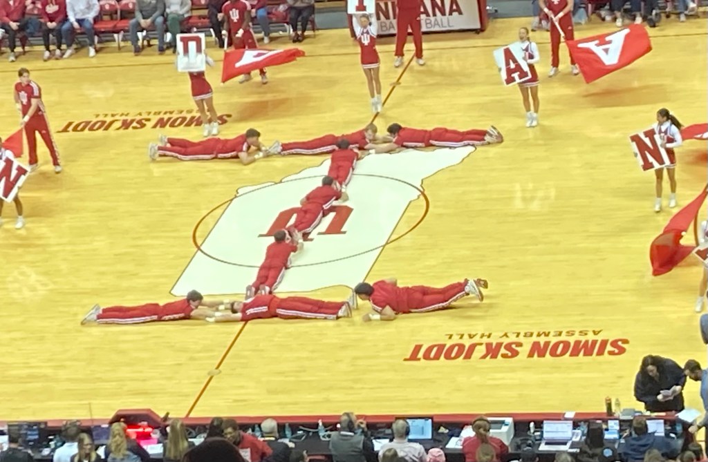 The darkened arena for the introduction of the IU playersStats at the end of the 2nd periodThe cheerleaders at the beginning of spelling out Indiana