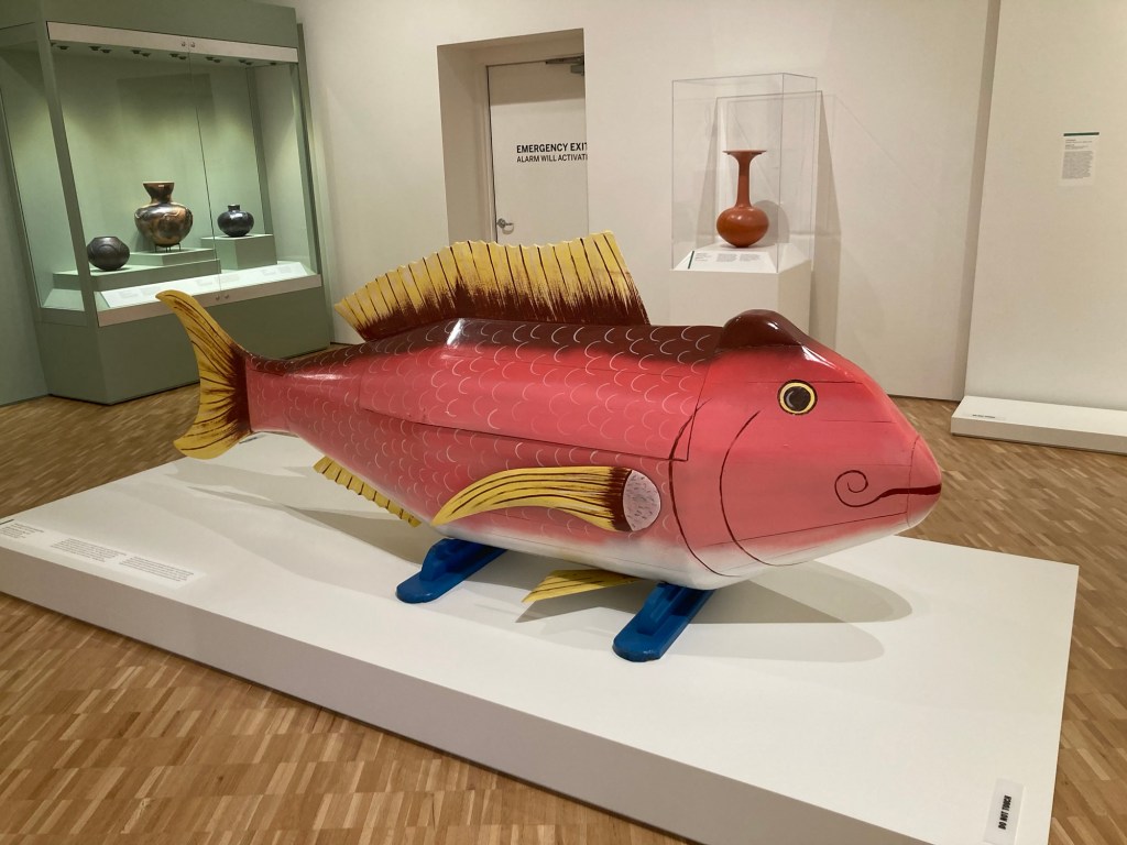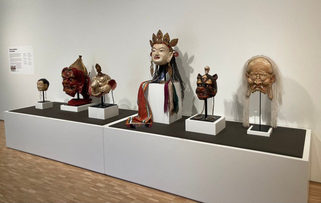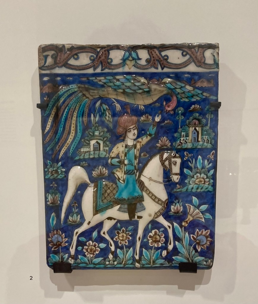 A collection of Tibetan masksA colorful tile from Iran from the 19th century, depicting a scene from the Qatar dynasty “Coffin in the Form of a Fish,” 2001, from the workshop of Ernest Anang Kwei, based on the Ghanaian tradition of commissioning coffins in shapes related to the deceased’s profession or status.