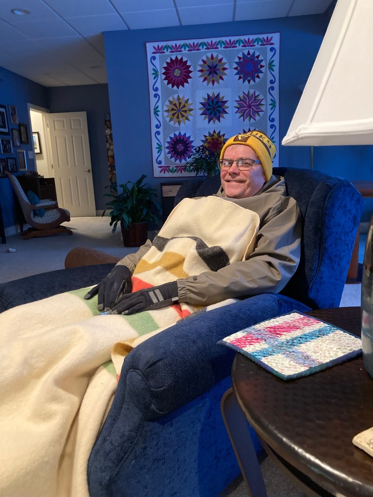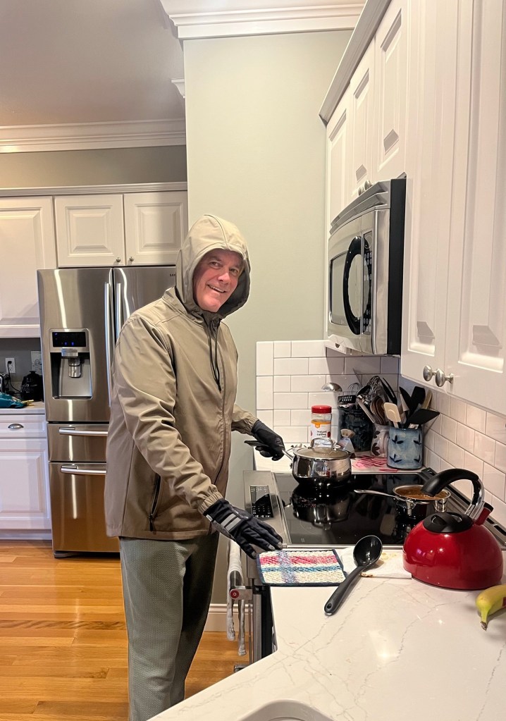 Long story, short, the main floors were down to 44 F this morning before the service company came with the part. Oh happy day! So now Bob doesn’t have to cook or watch TV dressed as below.