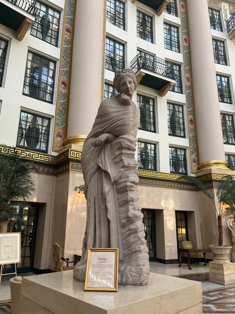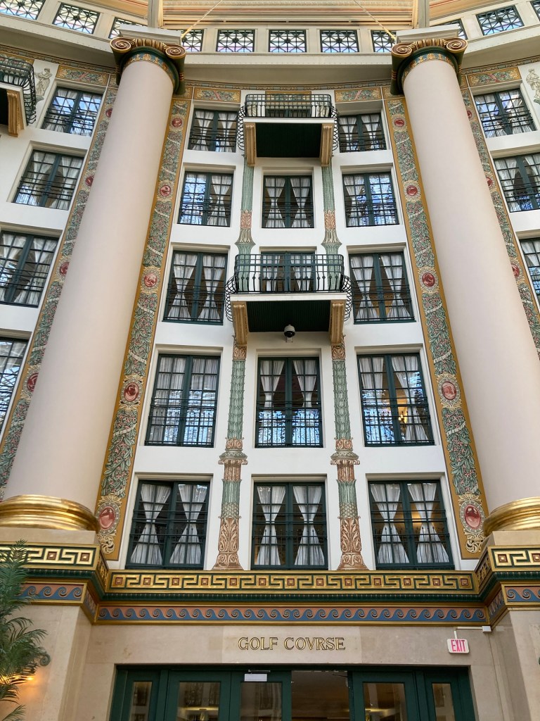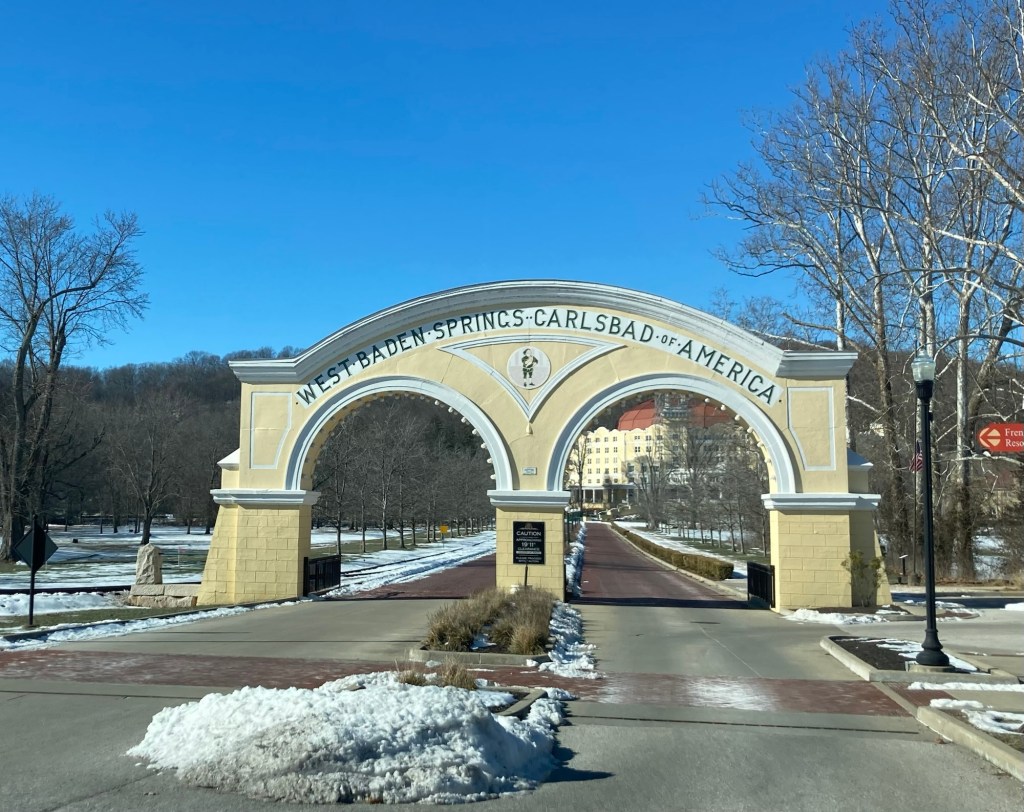 Driving into the very small West Baden Springs (population 574)The entrance to the drive into the resort (Carlsbad refers to a spa town in the Czech Republic. This was added with the arches in 1914)West Baden Springs HotelThe hotel lobby/atriumInside the stunning domeThe ceiling of the domeA closer view of the wallsPolyhymnia, the muse of hymns and sacred poetry, One of four statues in the roomA restaurant in a wing of the hotel