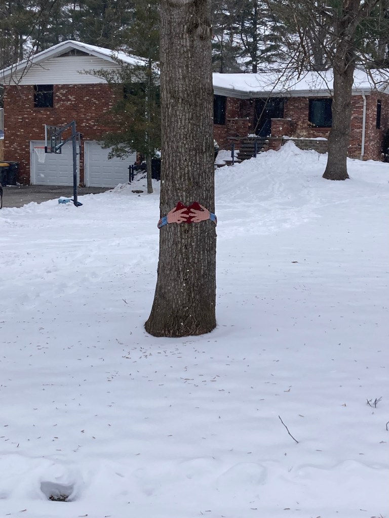 A trail through the neighborhood was nicely shoveled, but we were surprised by the No Soliciting sign along it.A sign of a tree hugger or an early Valentines Day decoration Part of our walk took us through some woodsThe patio after the new snow accumulation Jasper bummed by the snow