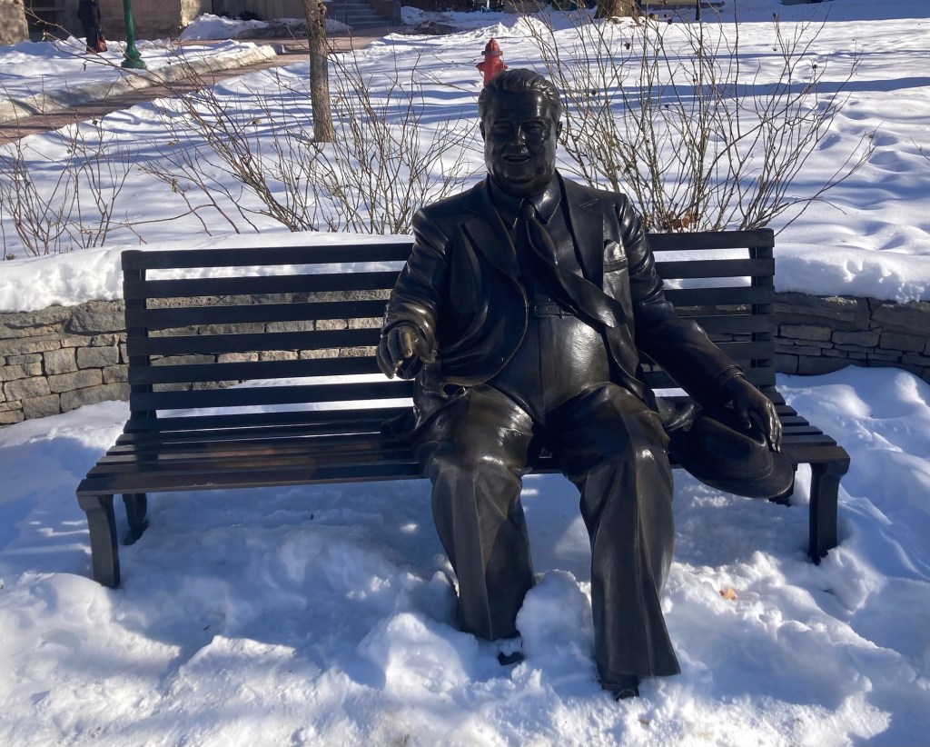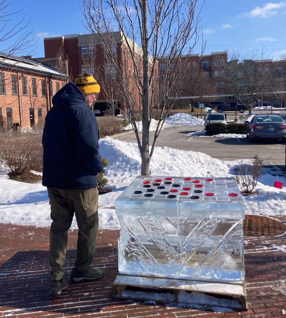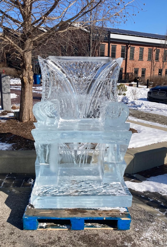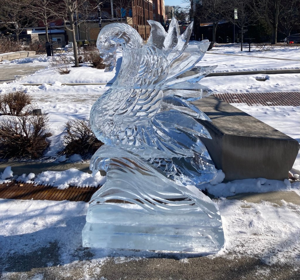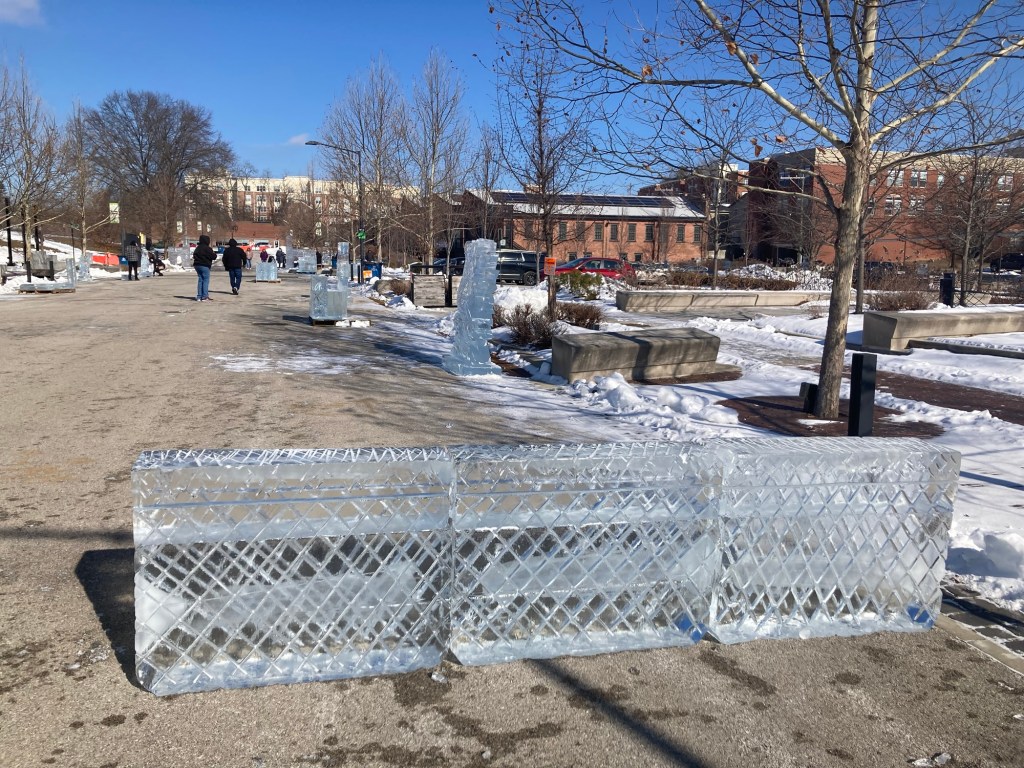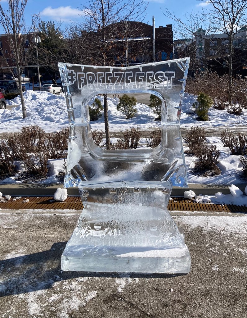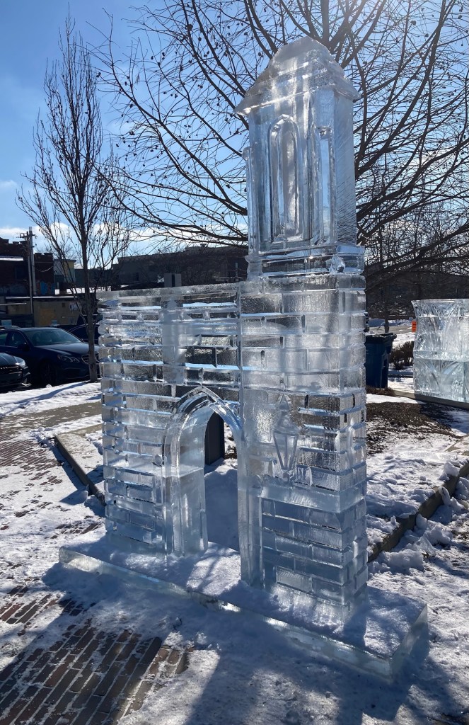 Looking down the walkway where the ice sculptures were displayed A swanA Freezefest frameA couple playing an ice version of cornholeI think this is Olaf from “Frozen”A chair/throneThere was one of these on each side of the start of the walkwayCheckers gameA temporary big heard photo op. Maybe a sportscaster for one of the university teams?A cute figure, but in the background on the hill, there is an ice path that kids (with parental supervision) were sledding on. They were going too fast and nearly crashing at the end.