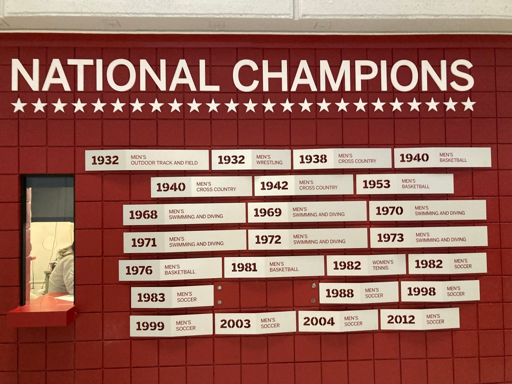 Walking to the basketball arena, we passed the IU football stadium.The basketball arena, Simon Skjodt Assembly HallA large wall painting inside the doors that we enteredA listing of the university’s national championships in various sports
