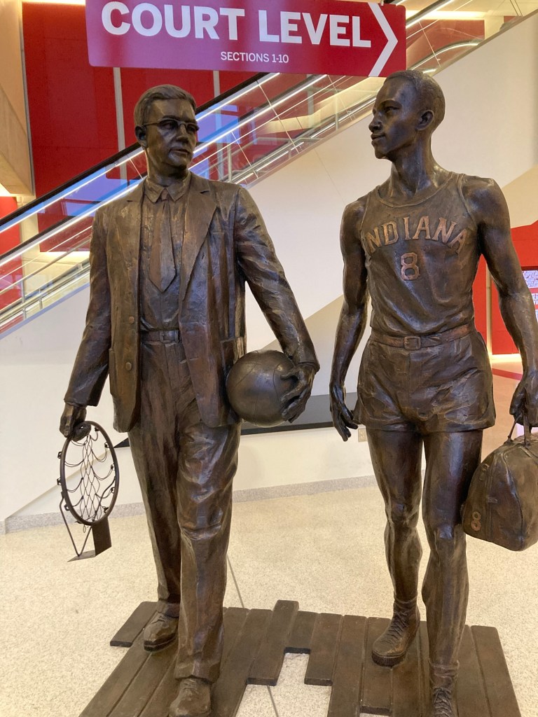 A statue of Everett Dean, known as the Father of Indiana Basketball. He was the first player to earn All American honors (1921), and as coach he led the Hoosiers to their first Big Ten Championship in 1926.Statues of Branch McCraken, who was coach of the teams that won the 1st two National Championships (1940 and 1953) for IU, and Bill Garrett, who was the first African American to play in the Big 10 Conference.These are statues of six of the players from the 1976 National Championship Team, that finished with a perfect 32-0 record, Bobby Wilkerson, Kent Benson, Scott May, Quinn Buckner, Jim Crews, and Tom Abernathy.The upper level of the arena, above the statuesA view from the seats before the gameUs in the seats before the game started