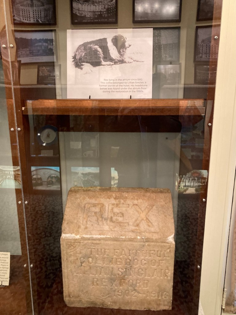 The headstone of one of the owners dogs that was found under the atrium floor during the renovation The green banded dinnerware used in the hotel throughout the1920s