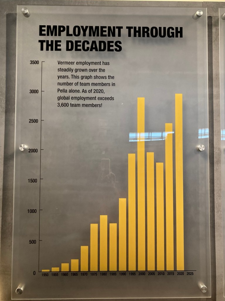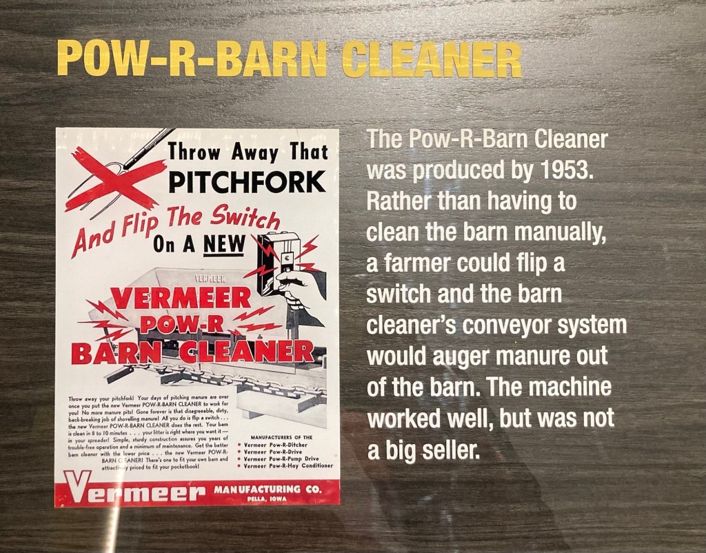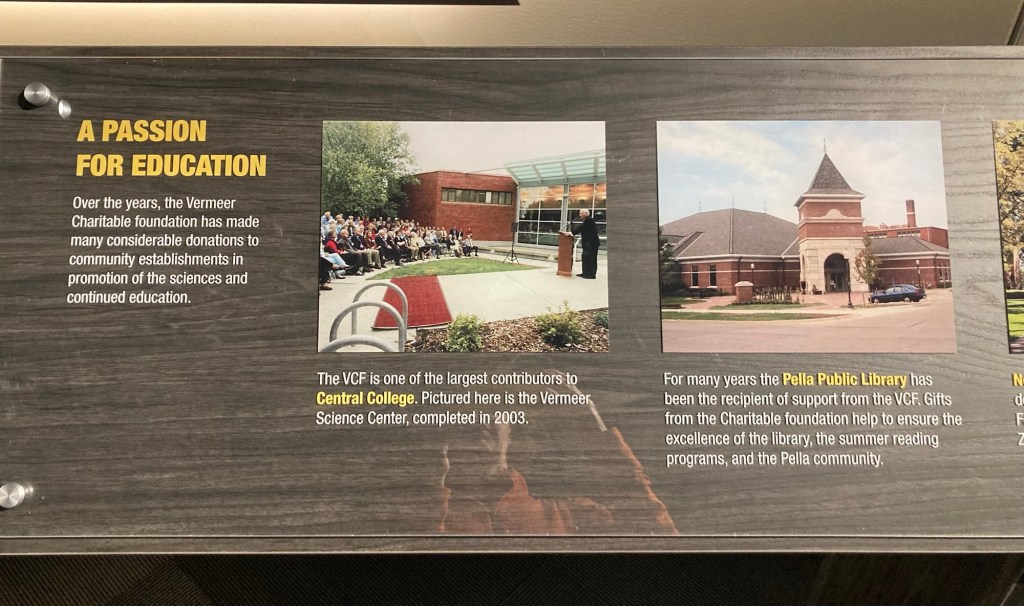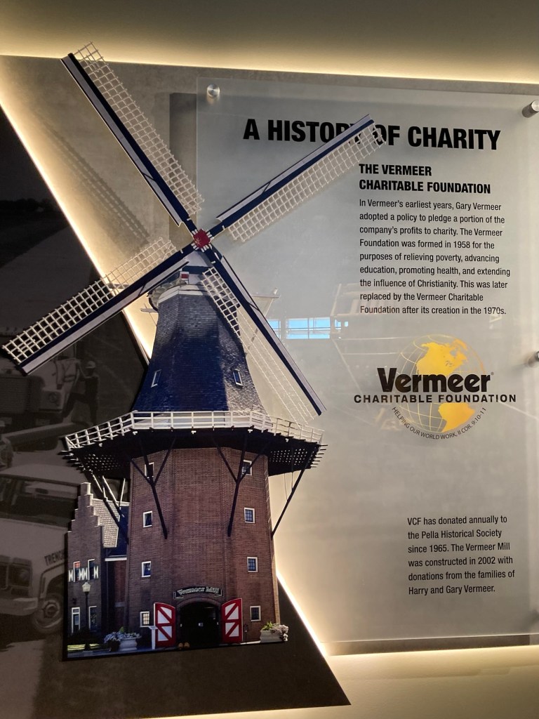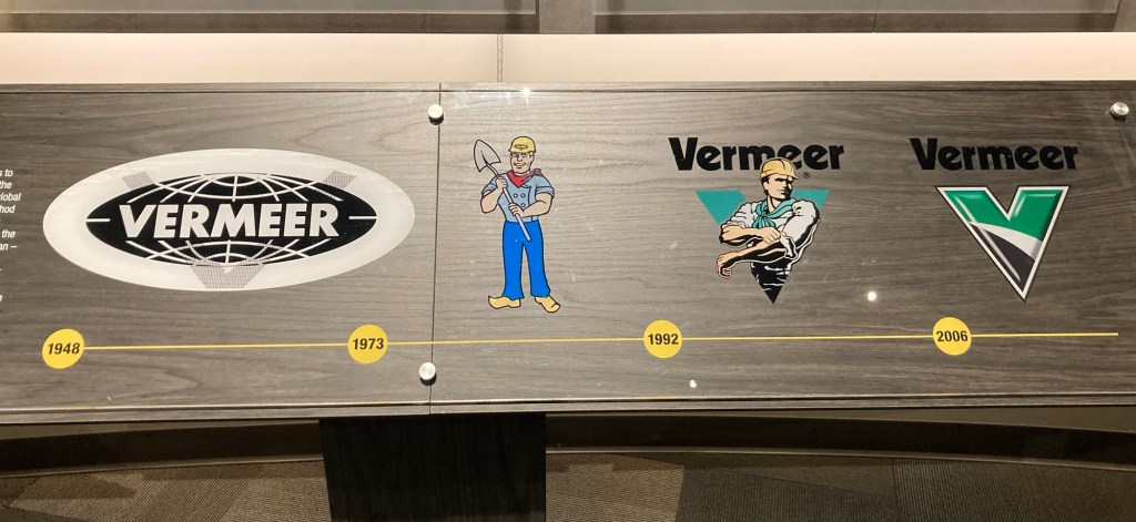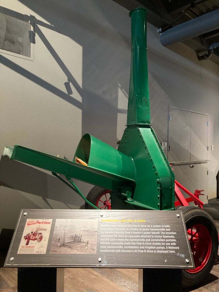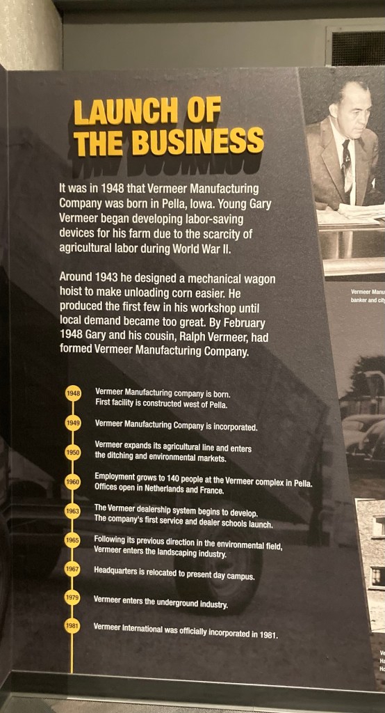 Today we stopped into a museum that we regularly drive by when going between downtown Pella and the house we are watching. It is associated with and on the campus of the Vermeer Corporation. This international manufacturer of agricultural and industrial equipment is headquartered in Pella on a campus known as The Mile. It borders a one mile stretch of road, now named Vermeer Road, starting with Plant 1 and ending at the property where fonder, Gary Vermeer lived and raised his family. The museum is located in the Global Pavilion at the one end of the campus.