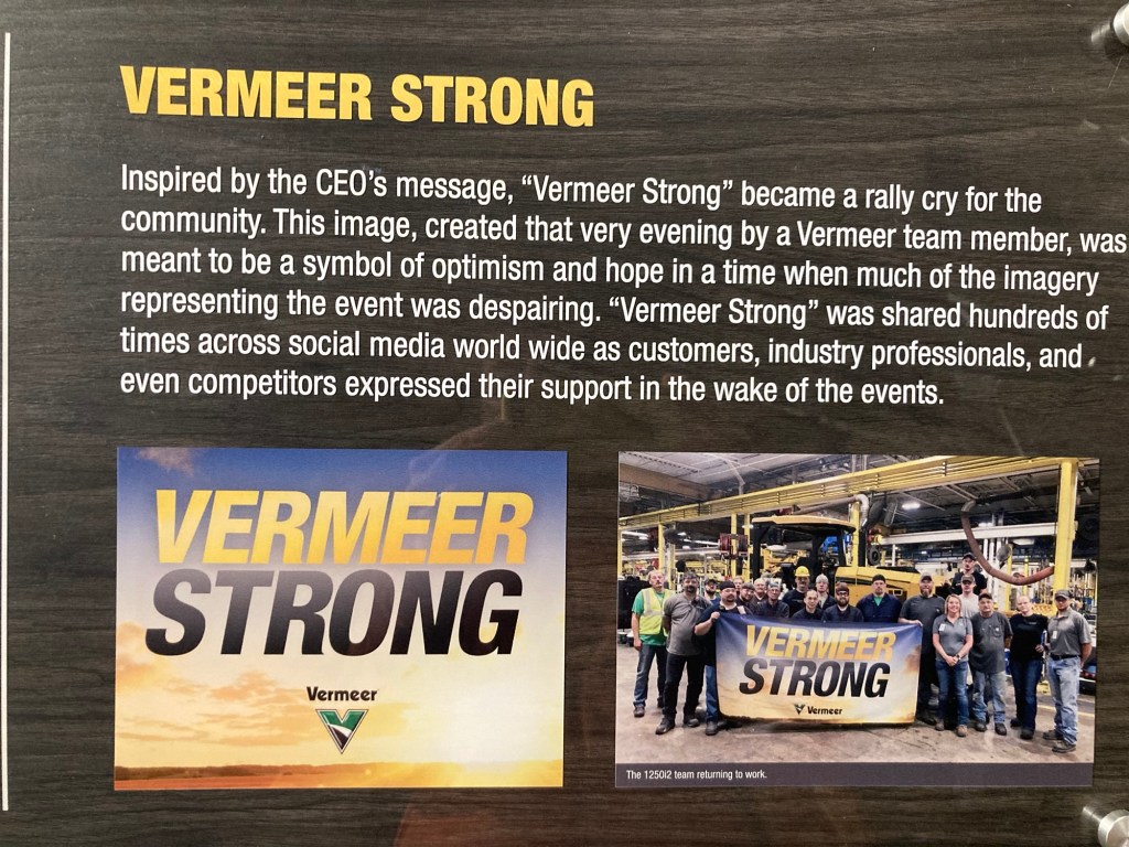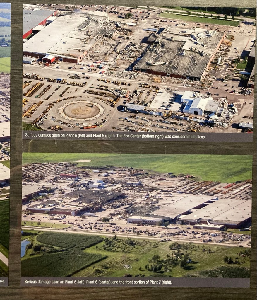 There was a whole exhibit on the effects of a tornado that hit the plant on July 19, 2018. 400 guests from around the world and nearly 3,000 team members were on site celebrating Vermeer’s 70th anniversary. Towards the end of the day, the campus sustained a hit from an EF3 tornado,, with wind speeds reaching 144 mph. While no major physical injuries or loss of life occurred, there was quite a bit of destruction to the campus as shown on the photos below.