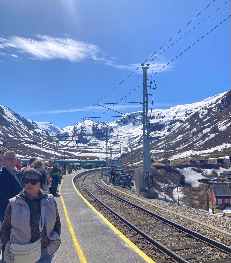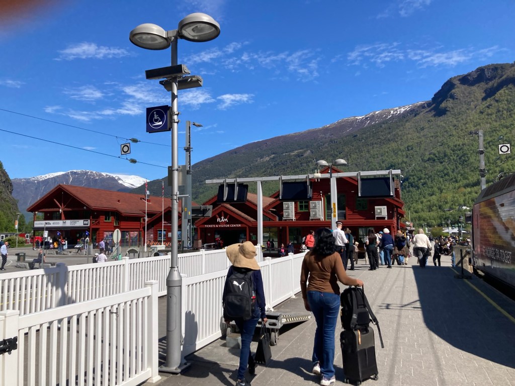 We arrived in Myrdal a little after 1:00 pm and walked across to the 2nd train platform to catch the train to Flam. We had lots of company. One of the highlights of today’s trip, besides the scenery, is that we traveled with only a backpack. Our big bags were picked up by the Fjord Tours company and have already been delivered to our hotel in Bergen.