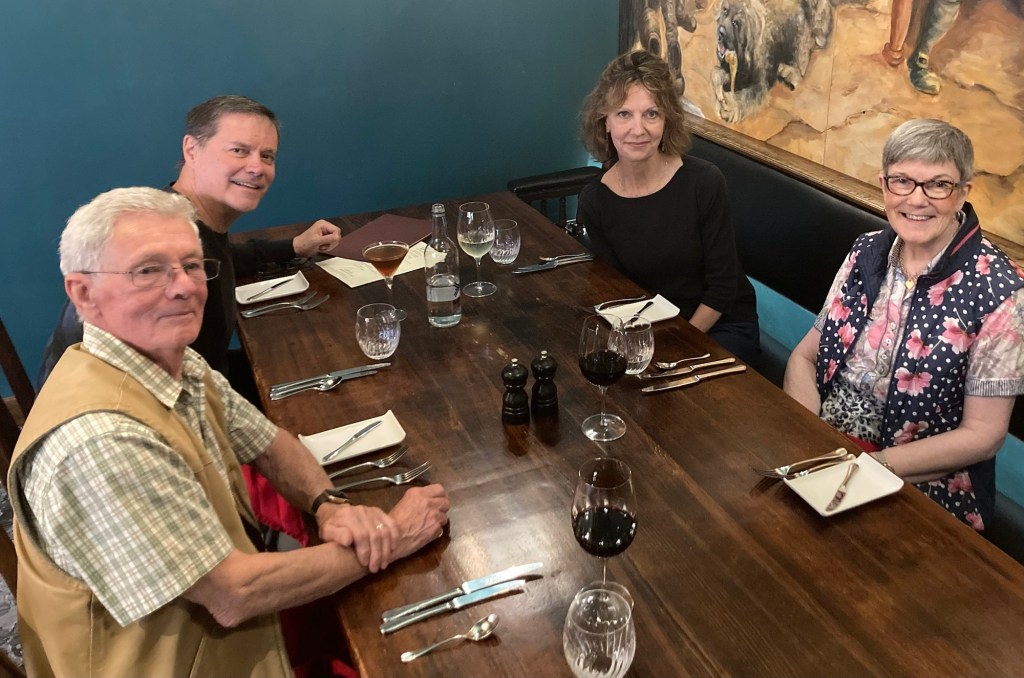 All wined up and ready for lunch —Stan, Bob, me, and Mary