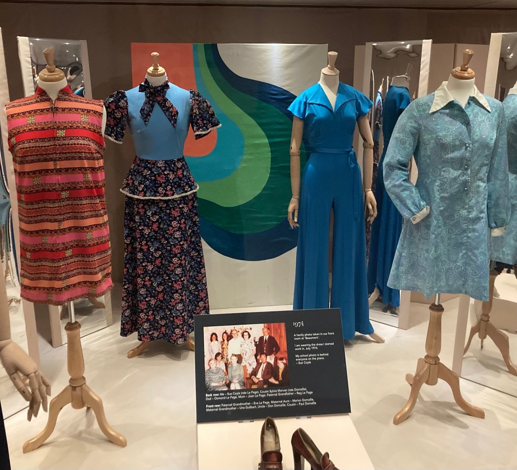 The costume exhibit was called From Cobblestones to Catwalks: 1970’s High Street and High Fashion. It seemed to primarily be based off donations from a local woman. It brought back scary fashion memories from that time.