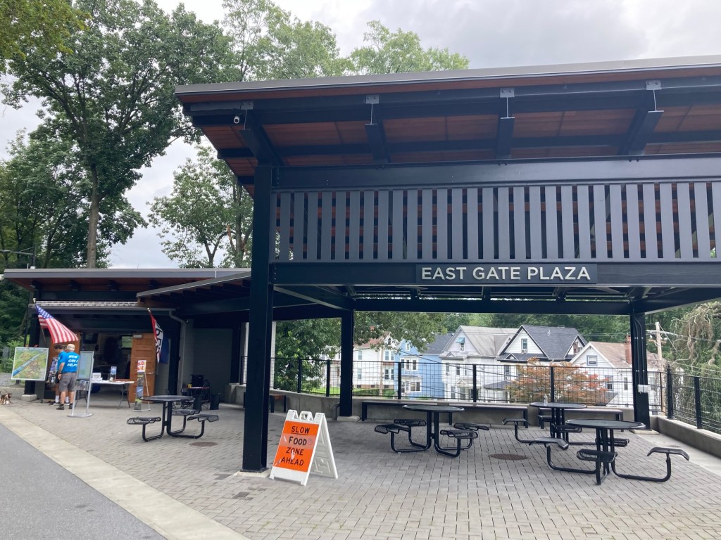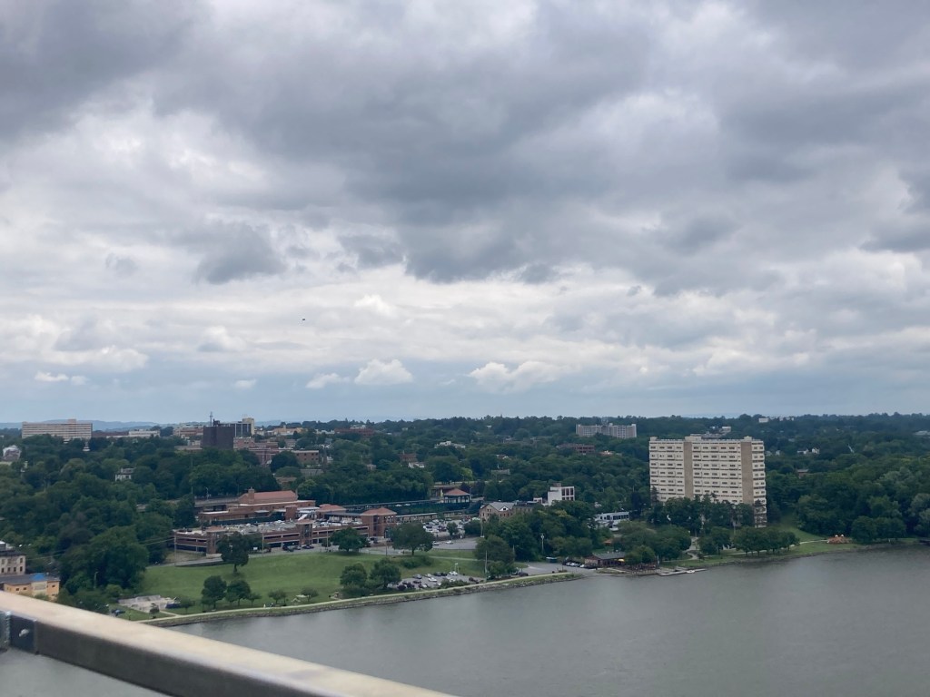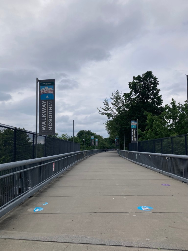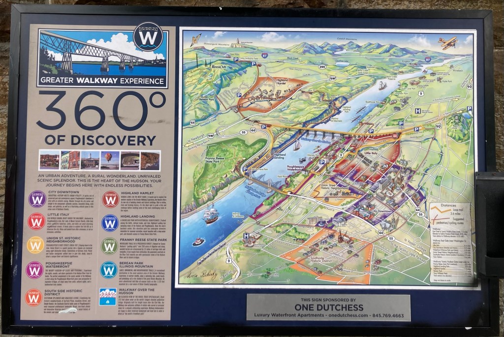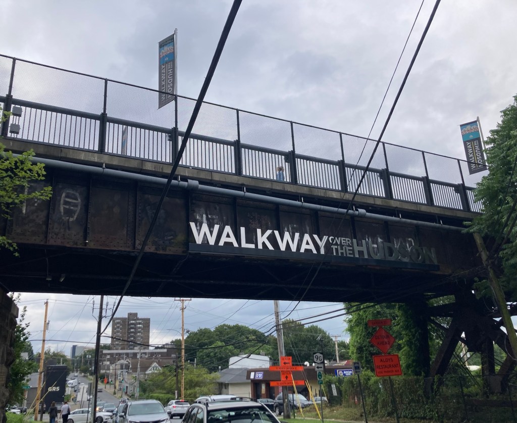 After Bob and I finished our visit to the FDR Library and Museum, we headed into Poughkeepsie to walk on the Walkway over the Hudson. This parallels the Mid-Hudson Bridge that we drove over to get into Poughkeepsie and then onto Hyde Park. The Walkway over the Hudson, formerly the Poughkeepsie Railroad Bridge, is the world’s longest elevated pedestrian bridge. It is a steel cantilever bridge spanning the Hudson River between Poughkeepsie, NY, on the east bank and Highland, NY, on the west. The bridge is 212’ above the Hudson River, and is 1.3 miles long.