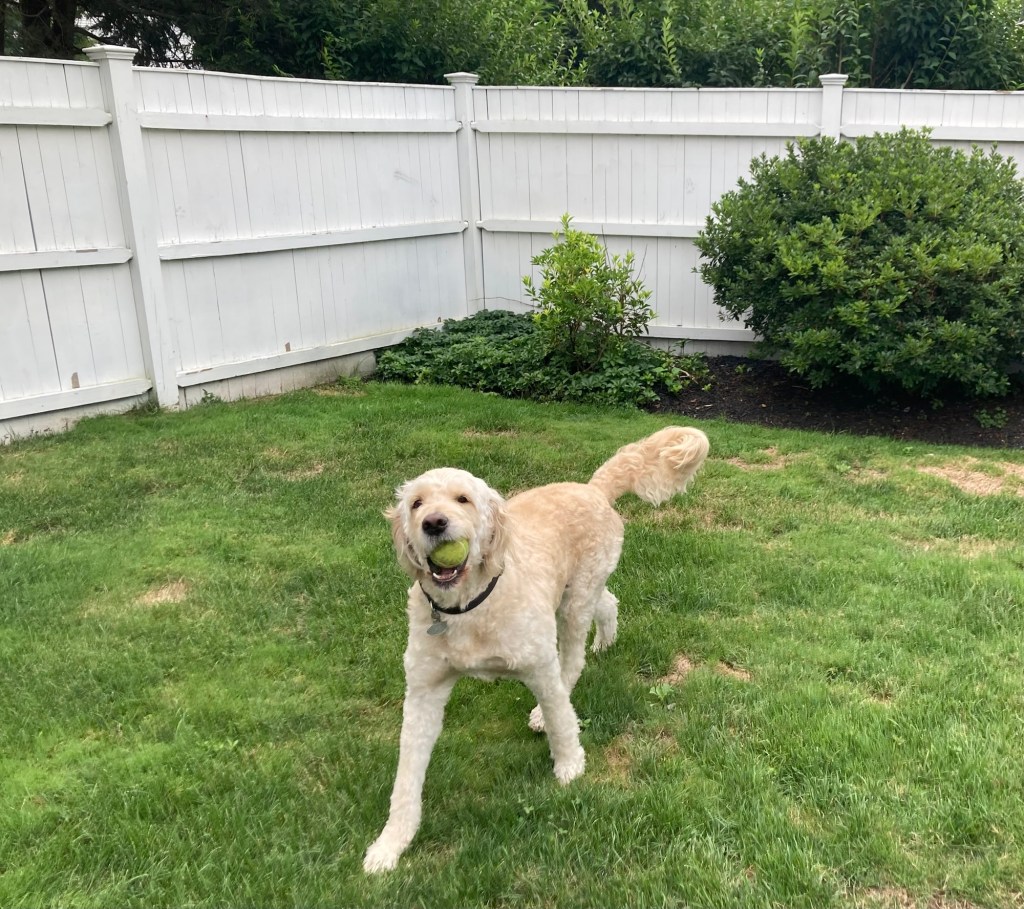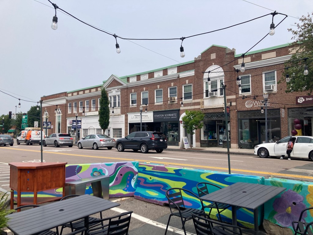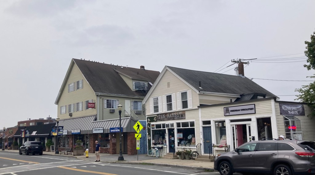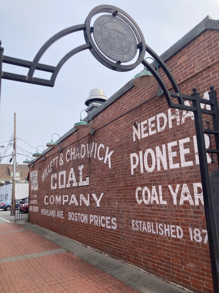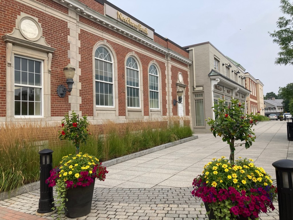 A fun find along the way.Pretty flowers and walkway outside the Needham BankA gate showing the year of incorporation of NeedhamInformation on a local man made good. Dr. Fisher founded the Perkins Institute of the Blind in Boston and is credited with introducing the stethoscope into the US.Needham TownhallA colorful muralSome of the stores in the town center Ditto, but looking over outdoor seating for a local custard shopA super cute pub.Zeus playing in the yard