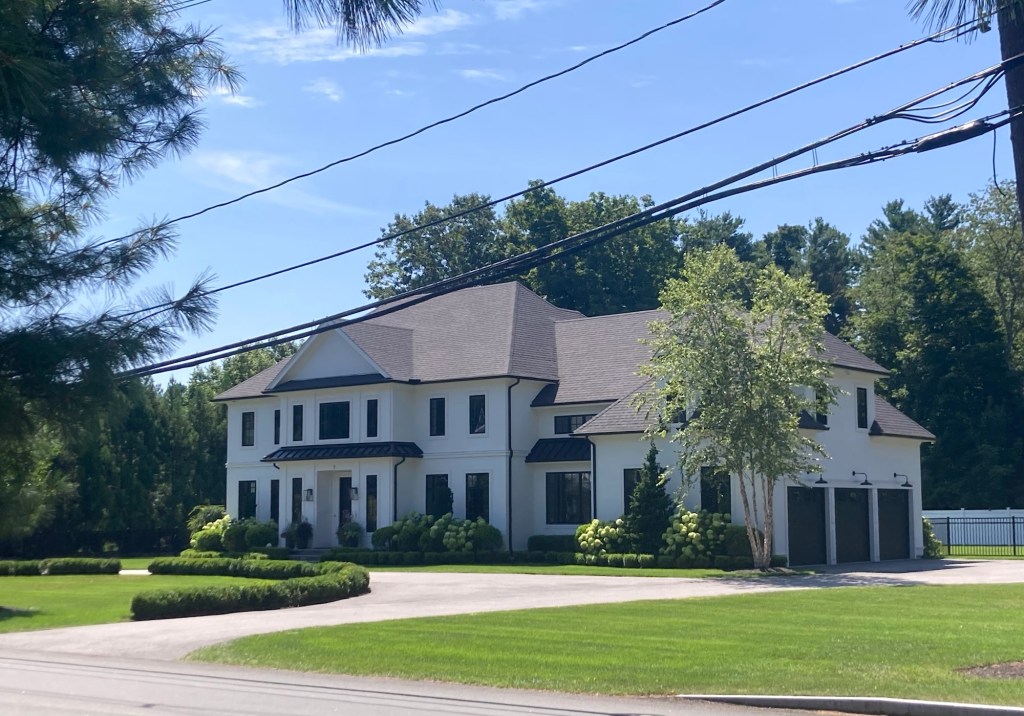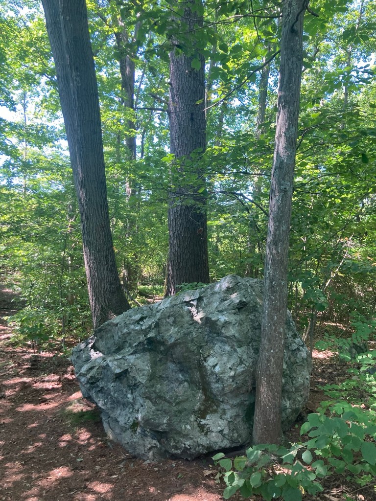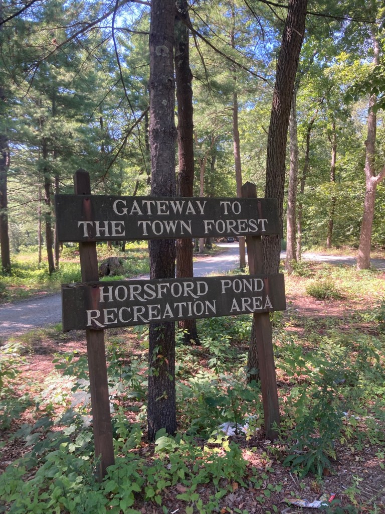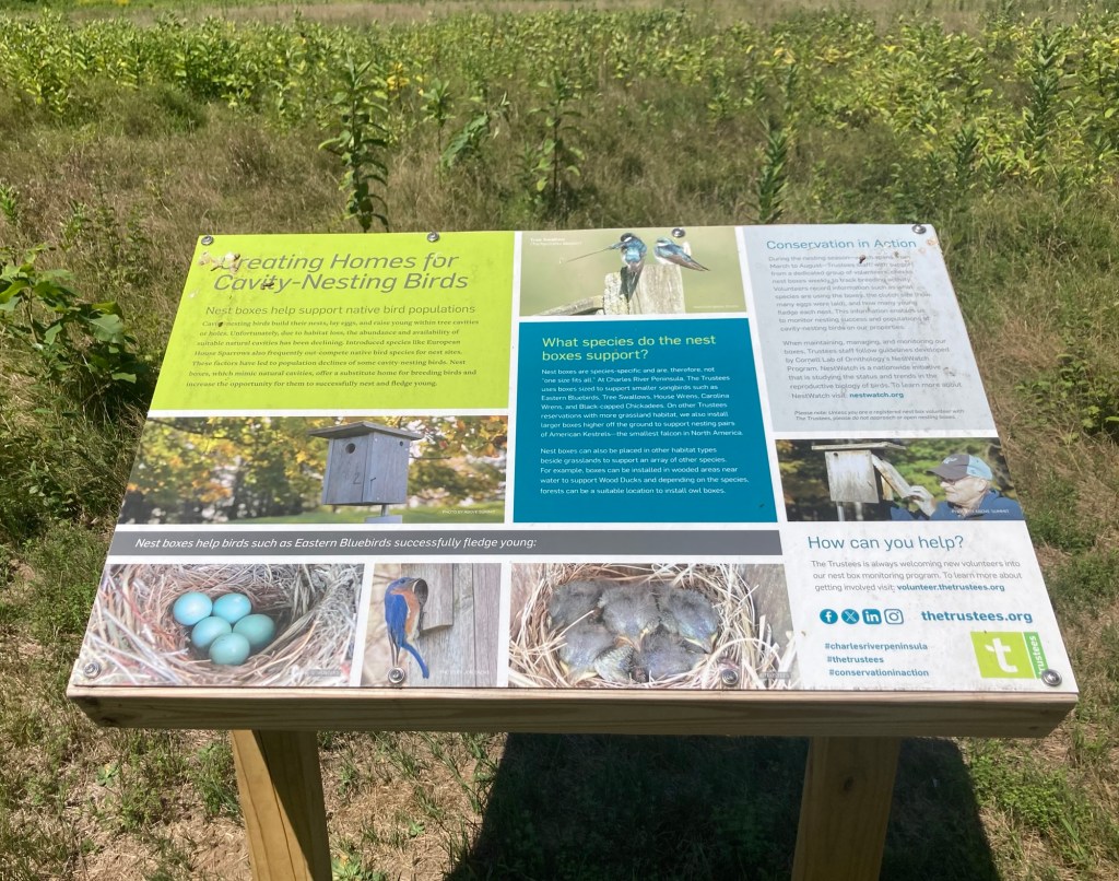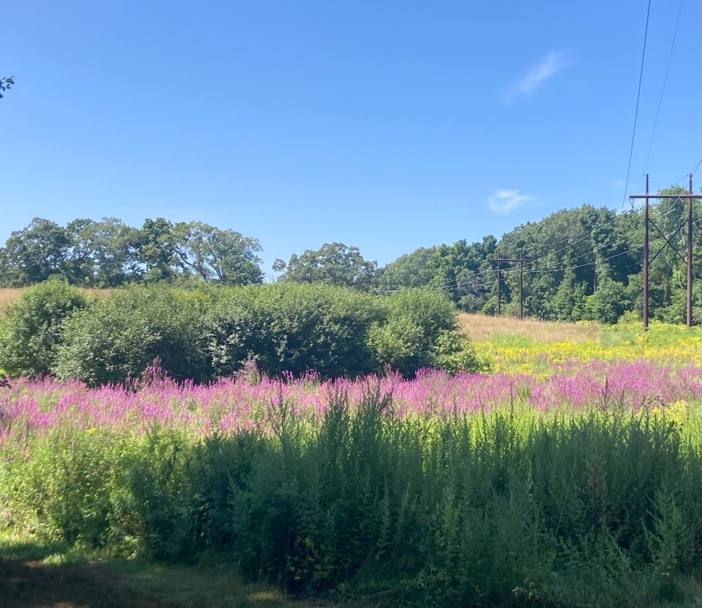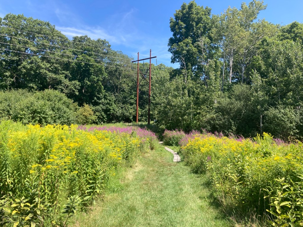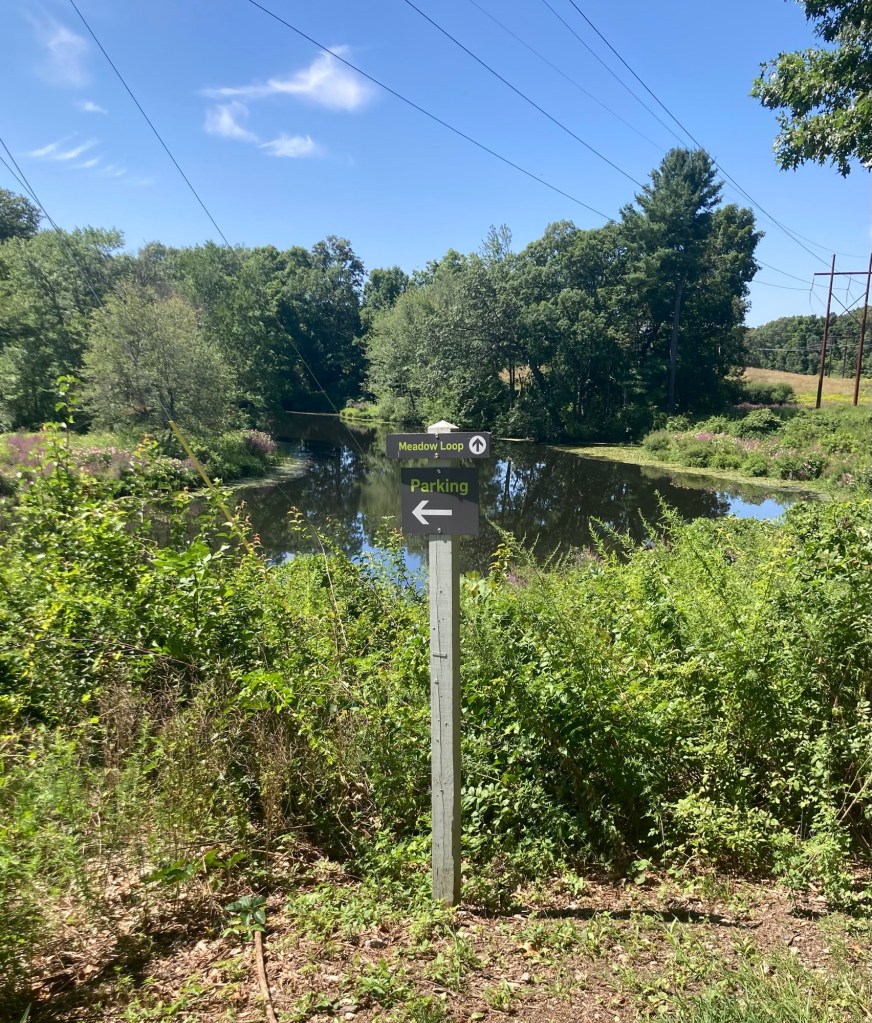 Bob had already discovered this place. It’s very close to us and apparently free to visit. May have to check it out.Needham has a town forest. This is apparently one of the access points. Another place to visit.The sidewalk ended on one side of the road, as it seems to do here, and then here the sidewalk is narrowing to a path.Looking across a pretty meadow to Sunny Hill Horse Farm. The houses and yards around here are impressive.
