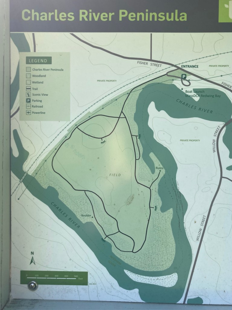 I had decided yesterday that for my first outing without Bob I would walk to the Charles River Peninsula (CRP). Per the CRP website, the peninsula plays an important role in protecting the beauty and environmental value of the Upper Charles River corridor. The peninsula rises to a 20-acre open field where the Charles River makes a nearly 180 degree turn. The Charles River is 80 miles long and flows northeast from Hopkinson to Boston.