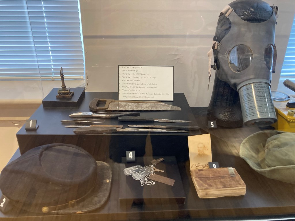 Various war-related items. The tools on top are from a Civil War surgical kit.
