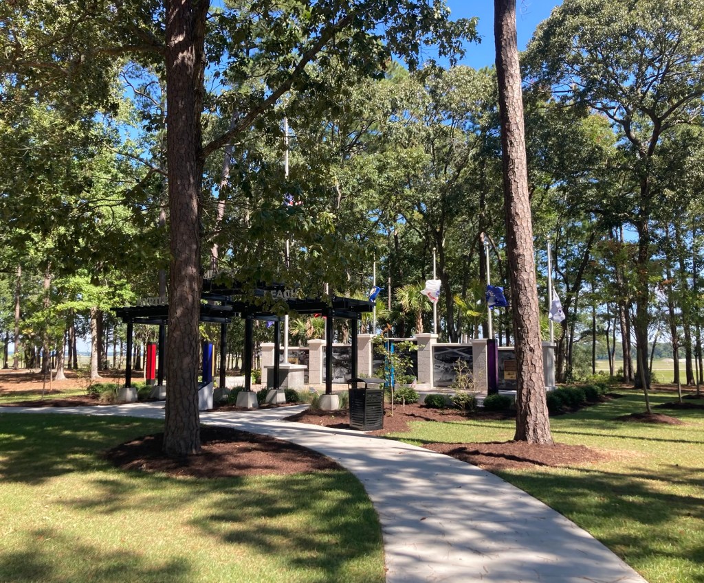 Bob and I visited Warbird Park today. It’s a small park on an old Air Force base behind Myrtle Beach International Airport that memorializes the contributions of local residents to the various wars in which the US has been involved. There is also a memorial to the victims of 9/11. It is a lovely little park near The Market Commons, where you can learn quite a bit about local war contributions, walk the lovely shaded paths, and/or watch planes leave from the airport.