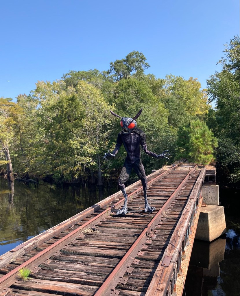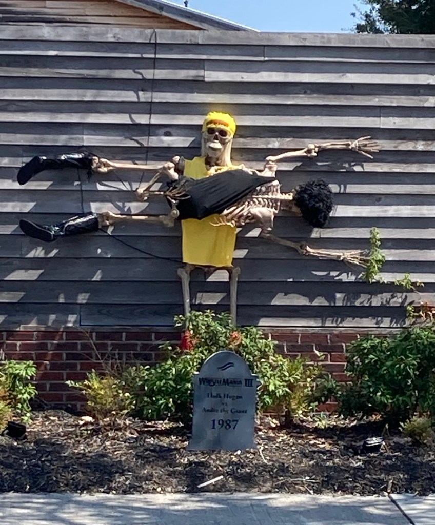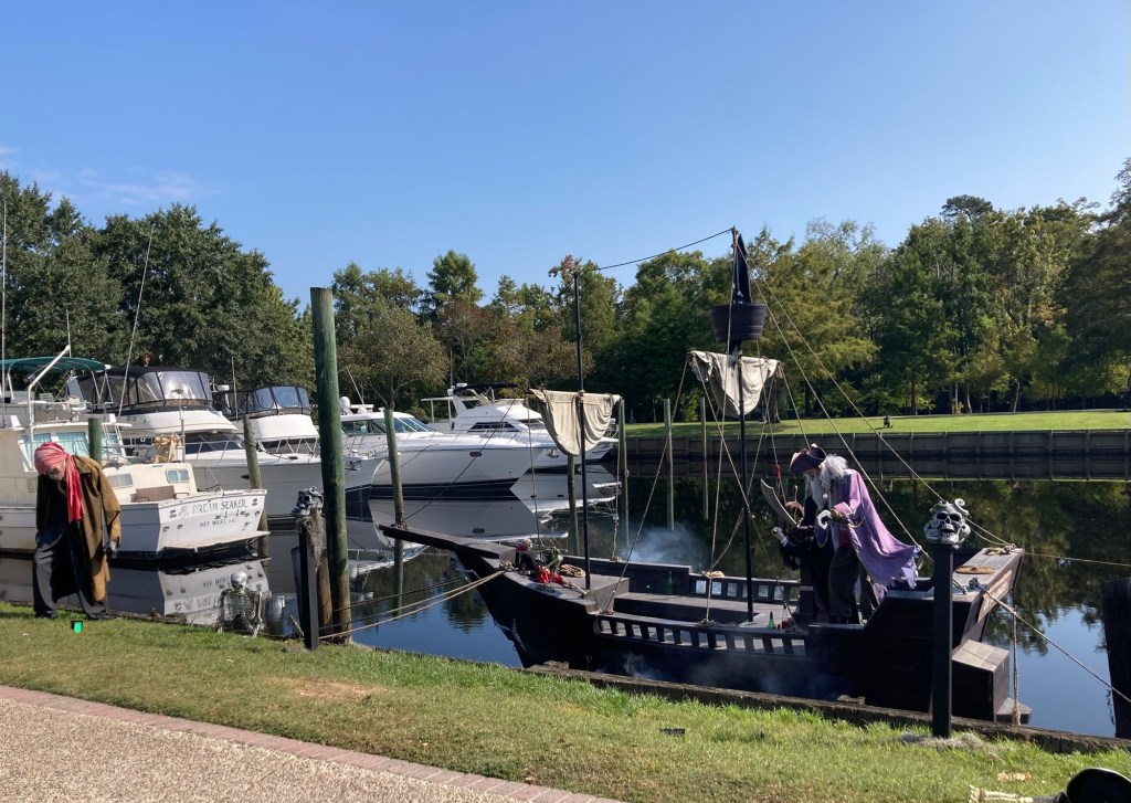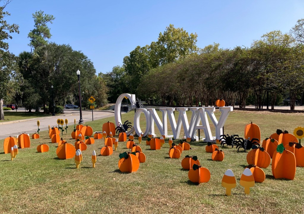 This was the first thing we saw when we pulled up. The boat was blowing smoke and music was playing.Almost all of the exhibits were playing recorded voices or other noises or exhibit-appropriate music.The pretty marinaLooking down the Waccamaw River towards the bridge we drove in onThe Conway Outpost at one end of the marina parking lotI loved that there was a boat going by right as I was taking this.Til death do us part…Say what?!The end of the lineThe shaded RiverwalkWho ya gonna call?The Halloween themed version of the downtown signAnother Conway sign just off of the RiverwalkThere are a number of murals on downtown buildings The downtown theaterAnother decorated park downtown Lots of alleys downtown. Many provide outside seating for restaurants, but this one is dedicated to the local Coastal Carolina University and space for relaxation and fun.This is in the Town Square which looked like booths were being set up for an event.Hulk Hogan was talking trash to Andre the Giant when we walked by.