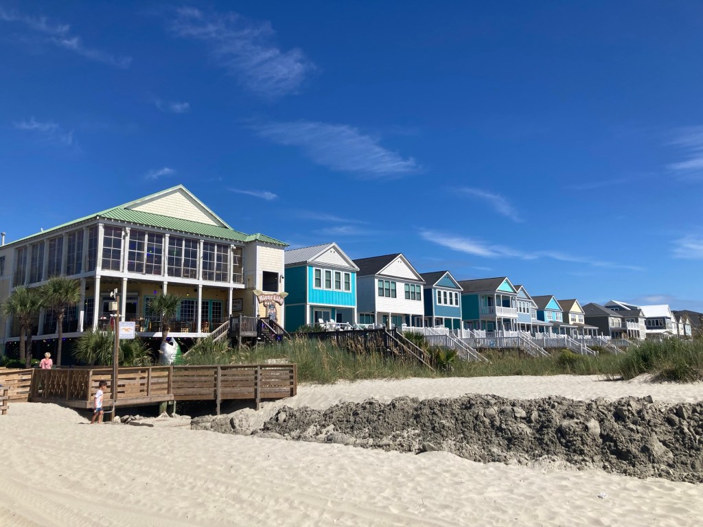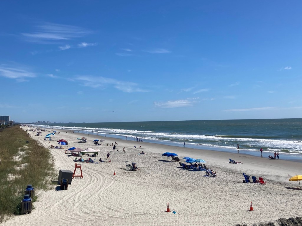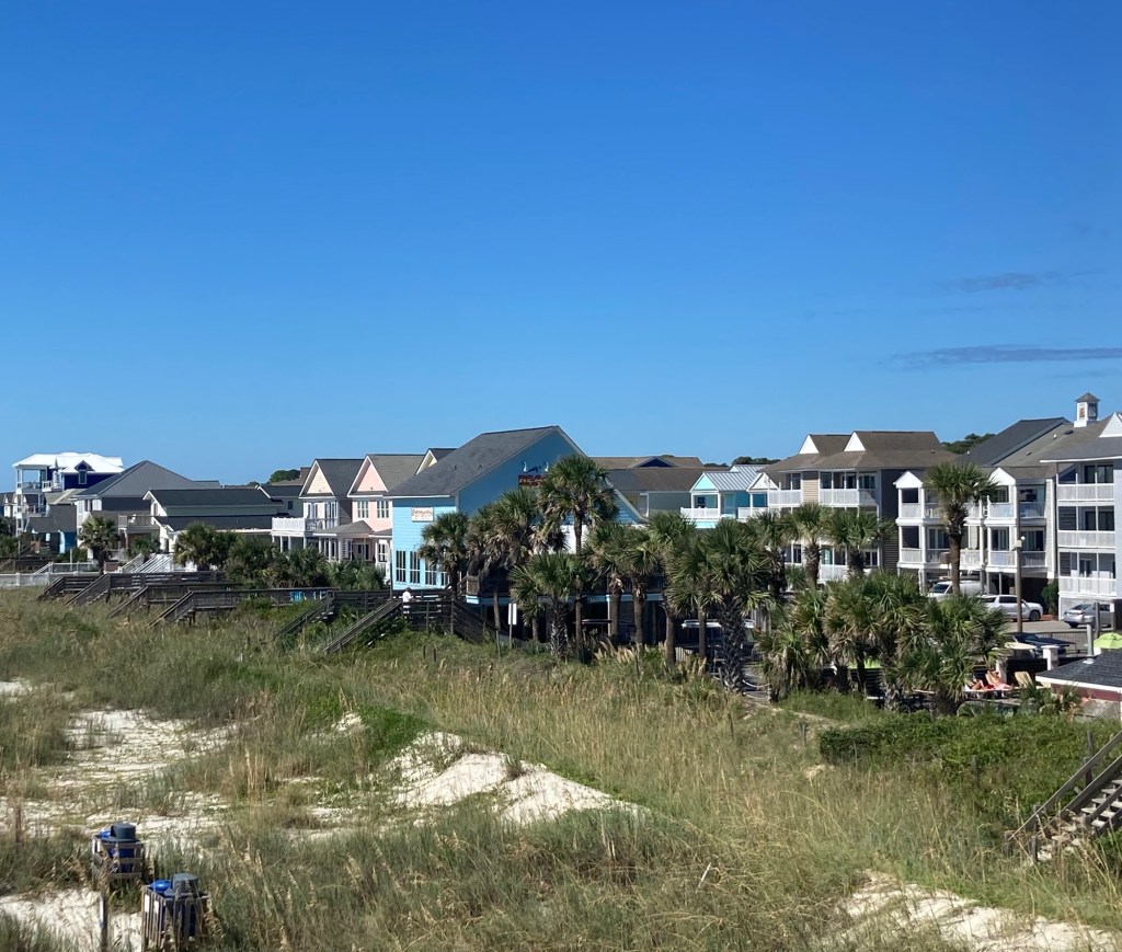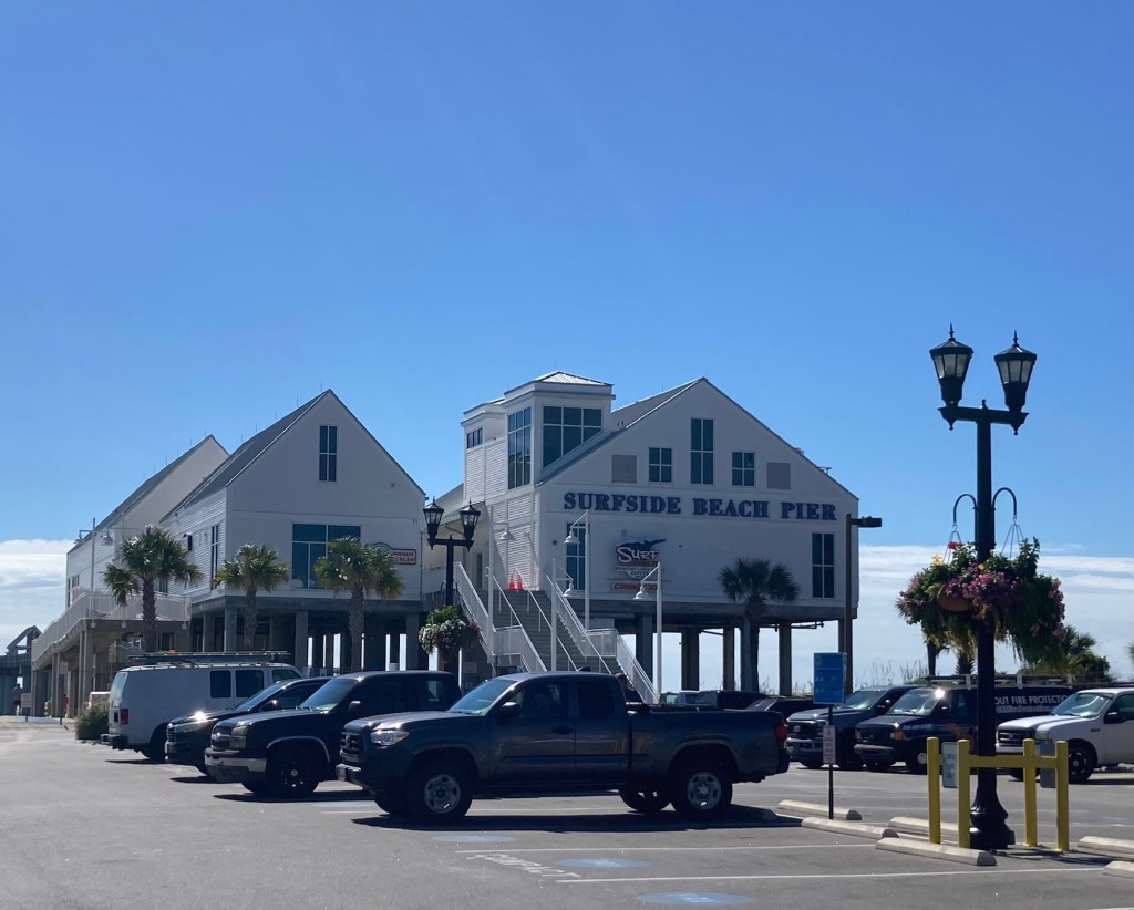 Surfside Beach is a town of about 4,000 northeast of Murrells Inlet. It is part of the Grand Strand, which is an arc of beach land on the Atlantic Ocean in South Carolina which extends for more than 60 miles. After we had looked around the market, we walked a few blocks to the beach. The houses (on stilts) were cute, it had a small restaurant area, and the beach was gorgeous. Lovely, high 70 degree F, low humidity day to be outside.