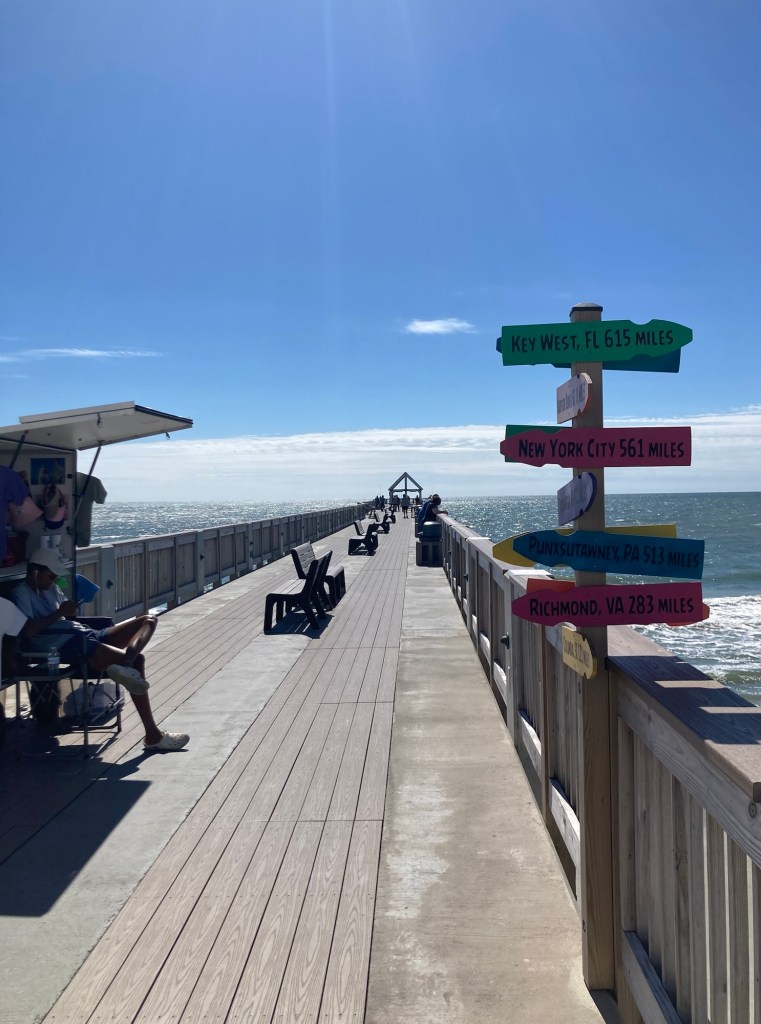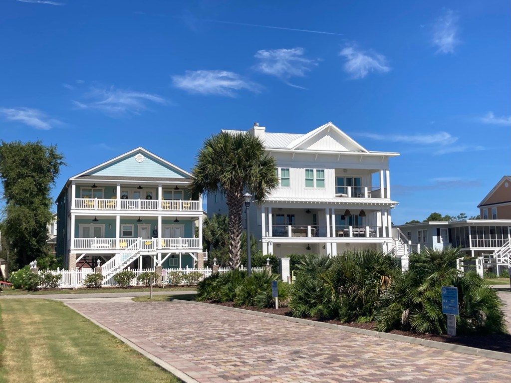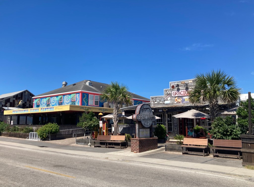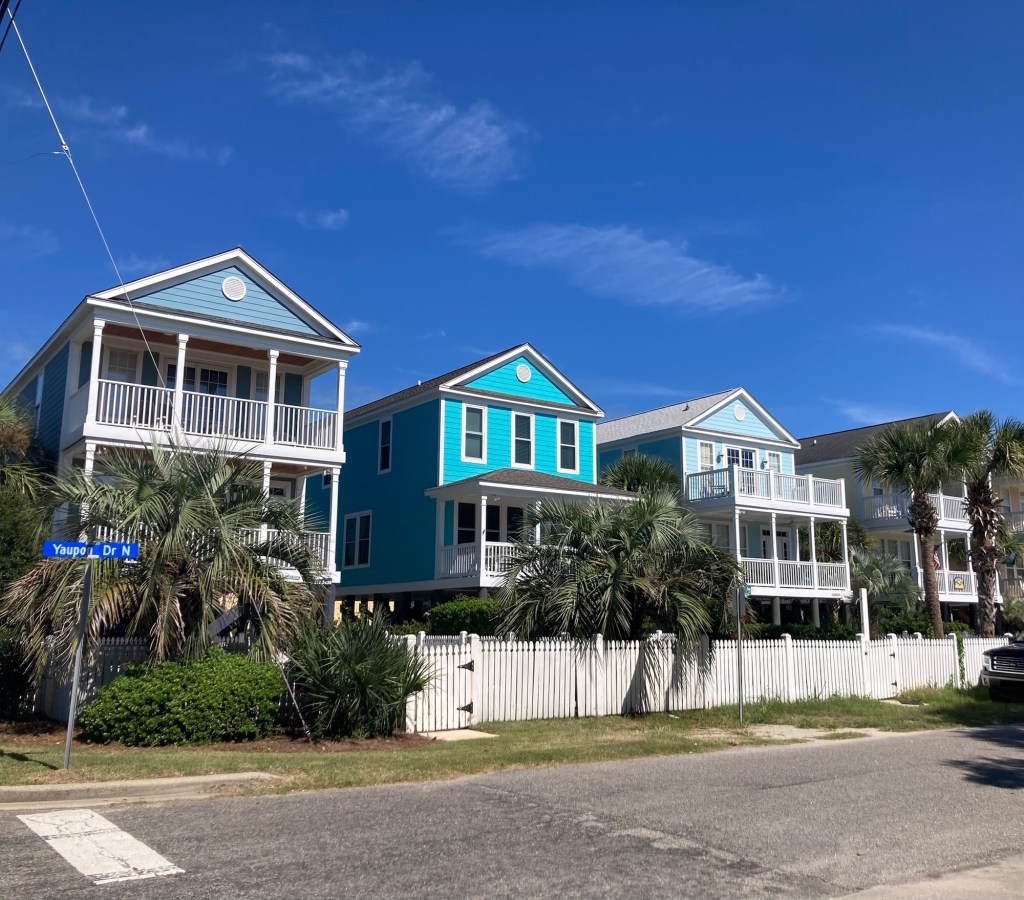 Surfside Beach is a town of about 4,000 northeast of Murrells Inlet. It is part of the Grand Strand, which is an arc of beach land on the Atlantic Ocean in South Carolina which extends for more than 60 miles. After we had looked around the market, we walked a few blocks to the beach. The houses (on stilts) were cute, it had a small restaurant area, and the beach was gorgeous. Lovely, high 70 degree F, low humidity day to be outside.