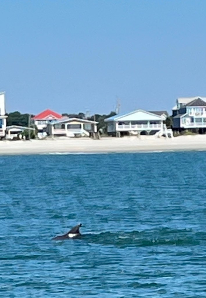 Once we got into the Atlantic across from some of the oceanside beach communities between Garden City and Myrtle Beach, we were able to catch glimpses of a number of dolphin in various pods around our boat. Unfortunately, for these slow-fingered photographers, they don’t pause their swimming to pose. The following shots are the best we could do, but they were fun to watch.