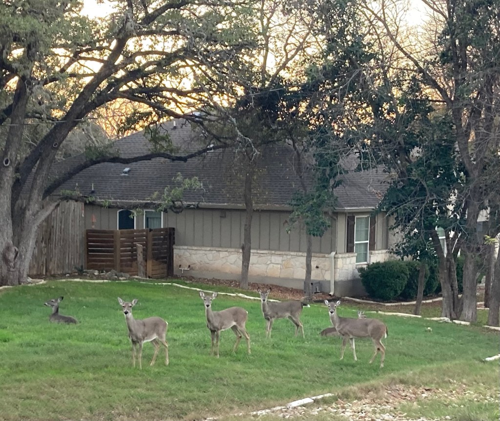 Our current housesit, another repeat, is in the hills west of Austin near the town of Bee Caves. There appears to be a very peaceful coexistence here between the home owners and their pets and the deer population.