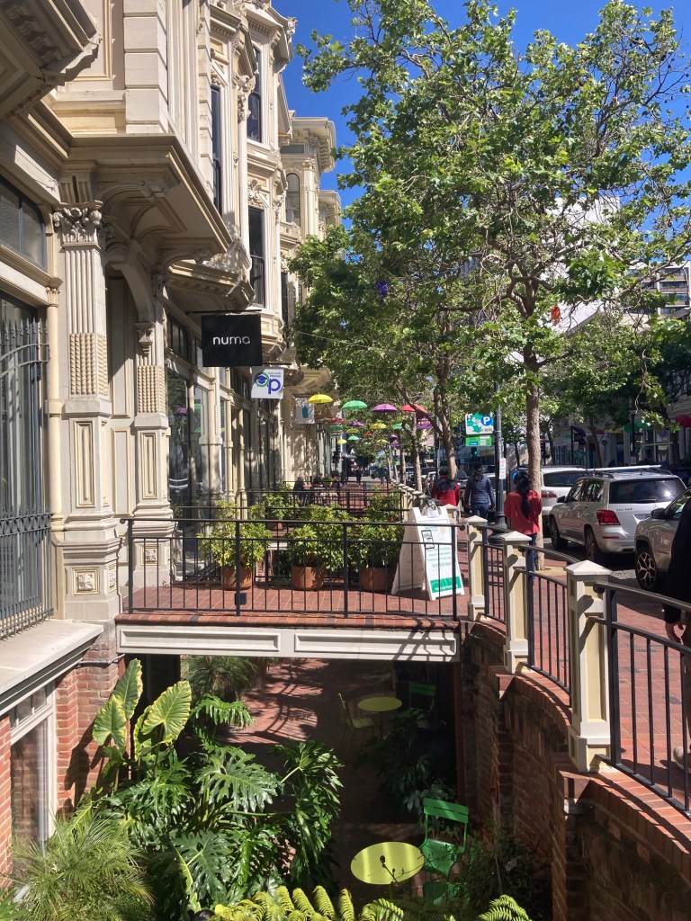 Last Friday the 10th, Bob and I traveled four stops north on the yellow BART line to the Oakland suburb of Rockridge to have dinner and a walk through of the home of our next Oakland area housesit. This is a couple that we did a housesit for 9 years ago shortly after we had sold our condo. We took to them and they to us, and although the stars haven’t aligned until now for us to sit for them again, we have kept in touch. It was lovely to catch up over a home cooked meal of fresh salmon and veggies, with a cherry cobbler made from sour cherries from Wisconsin. One of the homeowners is a fellow Wisconsinite.