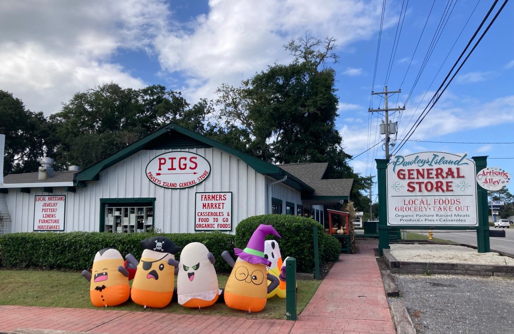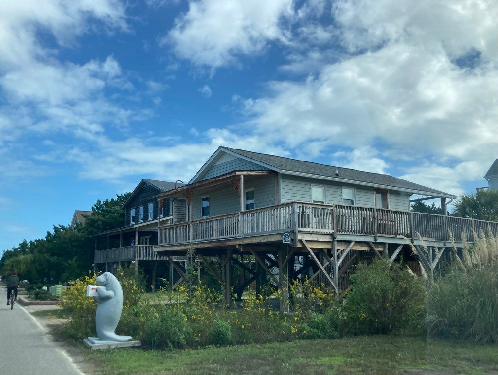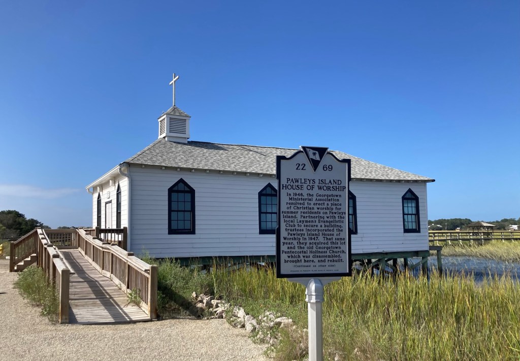 View as we crossed the causeway There are a number of these private piers across the street from the homes for fishing or tying up boats.The Pawleys Island House of Worship, which is actually the former Georgetown Pentecostal Holiness Church, which was disassembled and rebuilt here in 1947.Another view of a private pier in the inter coastal waterway between the island and mainlandOverlooking a small beach on the inter coastal waterway side on the southern tip of the island Walking onto a larger beachLooking across to the mainland The beach on the Atlantic side and the still choppy surfLooking north along the Atlantic coast Driving north on the main road of the islandOne of two inns on the islandA house on the islandThe old town hall, which was referred to as “The Shack,” the new town hall/police department building is nearby.A sign with some history about the islandMore homes and a fun mailbox The Pawleys Island General Store (PIGS) on the mainland