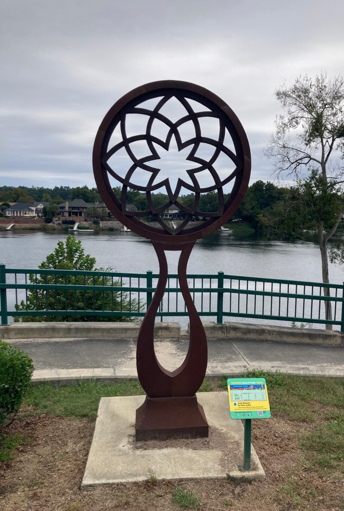 A view of the canal from one of the bridgesFrisbee golf at Lake Olmstead Park, near one of the trailheads along the walkLake OlmsteadA sculpture of the Rocky Shoals Spider Lily, which still grows along the Savannah River and canal, but is considered imperiled in Georgia.A school group on a narrated boat tour on the canal.A bridge that we crossed to get back on the other side of the canal as we headed back into town Looking back along the canal“Navigating History” by Kathleen Girdler Engler, 2006.