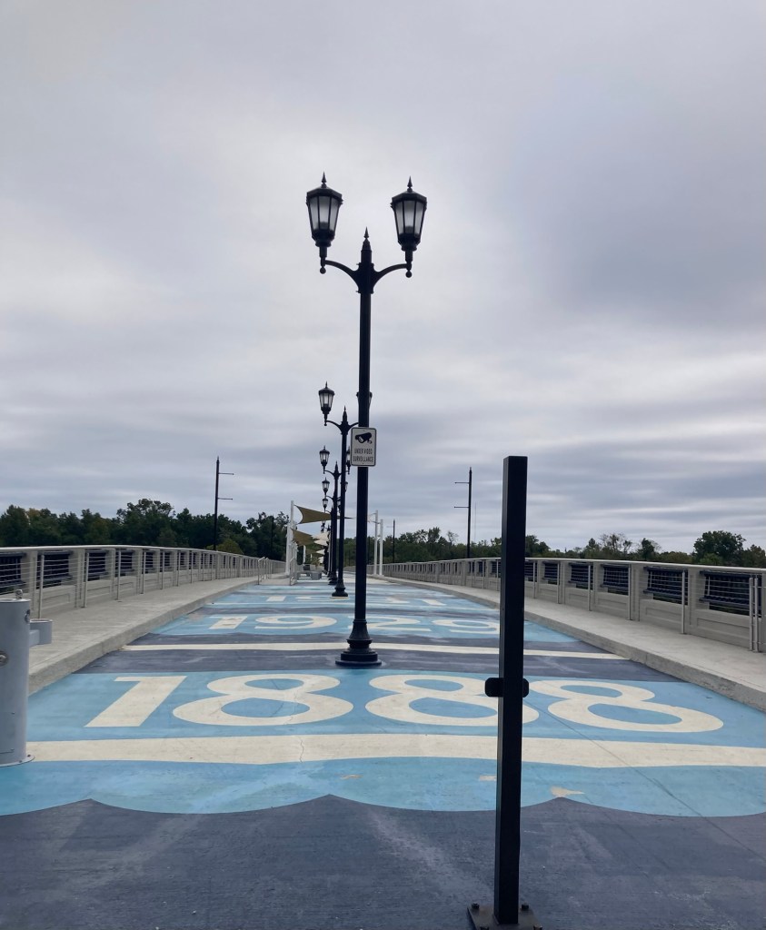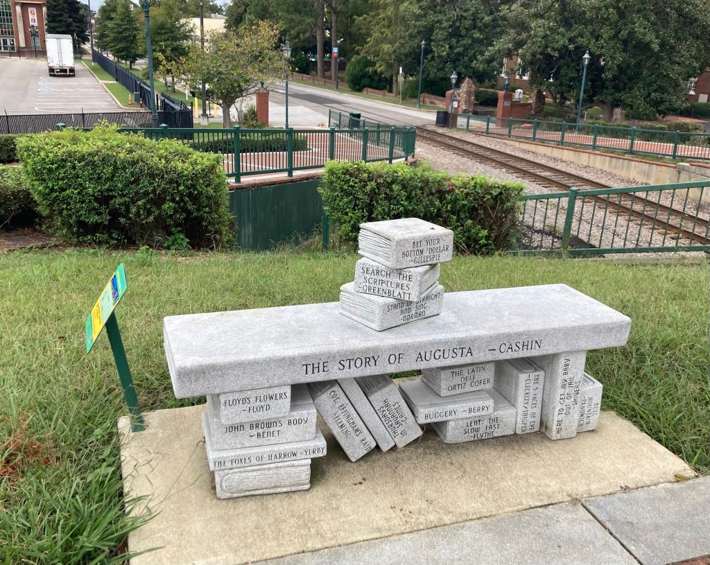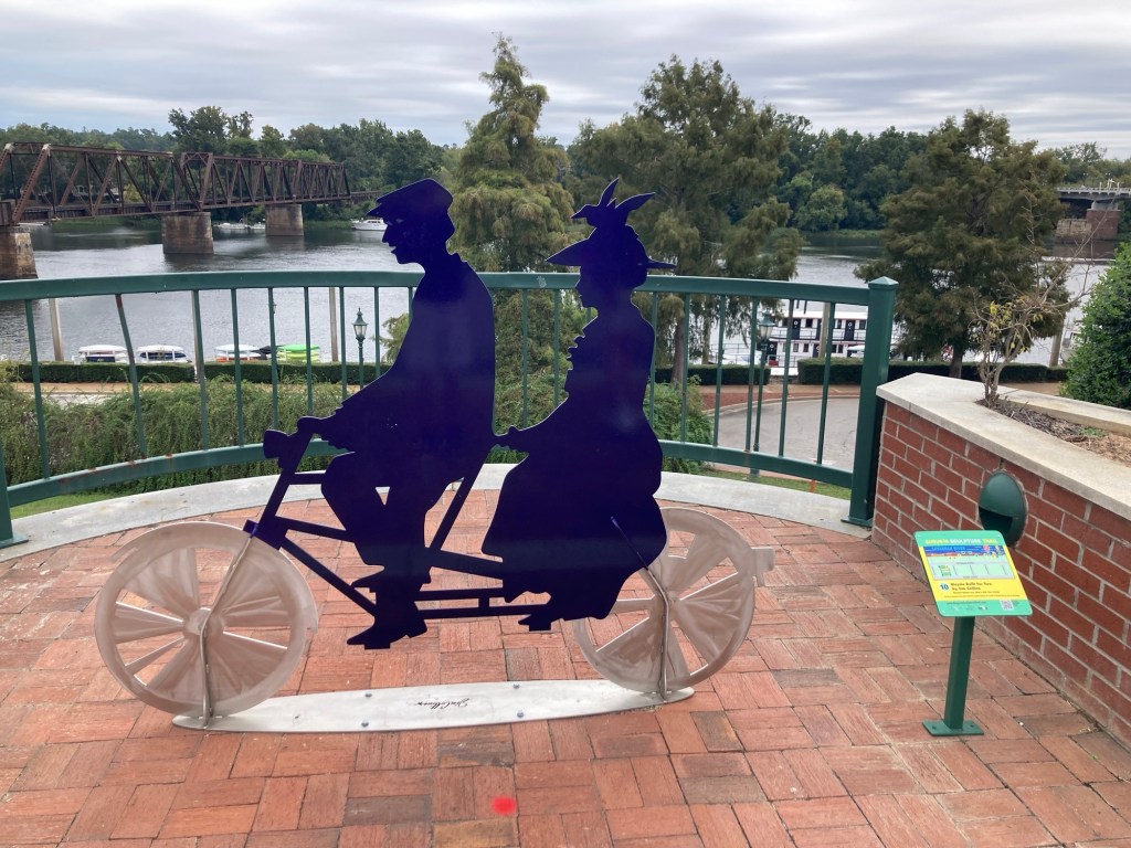 There were a number of flags along the walk with their names and the years they were flown. The blue one in front is the Bonnie Blue Flag flown from 1860-61, the unofficial first flag of the Confederacy.Some historical information “Lotus Blossom” by Beau Lyday“Book Bench — A Novel Idea” by Craig Gray“Bicycle Built for Two” by Jim Collin’sThe pedestrian bridge connecting Augusta, GA, and North Augusta, South Carolina. It is sadly, although not surprisingly, named the Jefferson Davis Memorial Bridge.