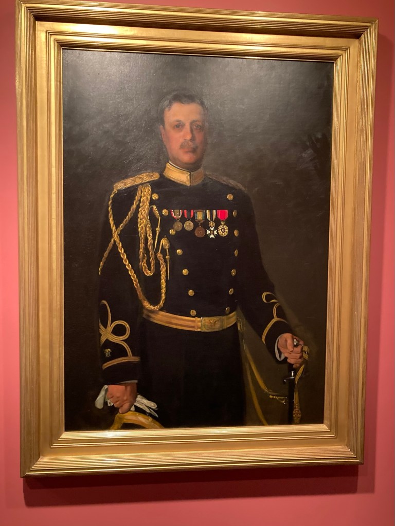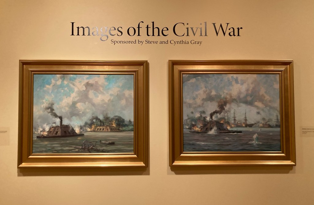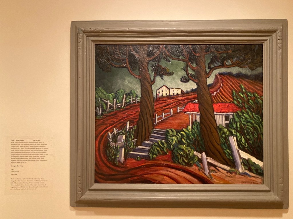 The entrance to the museum on the bottom floor of a building which also houses the Chamber of Commerce. The main exhibit area is on the second floor.The entrance was decorated for Halloween. This is “Megumi” by John Petry, 2011.This is a portrait of Major Archibald Butt by Francis Davis Millet, 1909. This caught my eye, as Bob and I crossed a bridge named in honor of Major Butt yesterday. He was born in Augusta, served under two presidents, and died on the Titanic.There was a whole room dedicated to paintings about the Civil War. These are “Battle of the Ironclads” by Gordon Hope Grant, 1951.I love the glass work! There was a whole roomful. This is “Tulip Vase” by Tommie Rush, 2015.There was also a room for Southern landscapes. This is “Bayou Teche” by Meyer Straus, 1870.“Georgia Red Clay” by Nell Choate Jones, 1946A window and seats in an exhibit hall“Daughters of the South” by Jonathan Green, 1993
