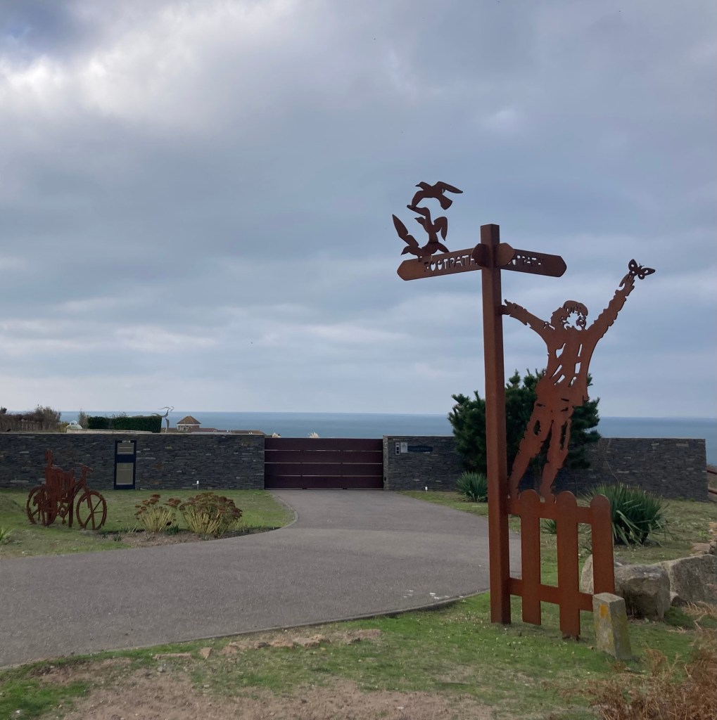 The pretty, shaded Rail Trail along the old railway Our first glimpse of the southwest coast of the island Fun metalwork marking the footpath Corbiere Lighthouse, built in 1874 and accessible by causeway at low tideA happy tribute to the successful rescuing of all crew and passengers from a sinking shipThe impressive coast and equally impressive buildings A German infantry defense structure on the right and what we think is a hotel or innBob and the lighthouse