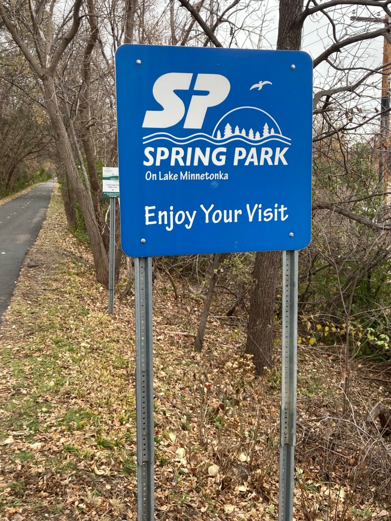 Signage on the trail near the parking lotWelcome to MoundA map of part of the trail. We walked towards Harrison’s BayThe trail is built along one of the old spurs of the Great Northern Railroad A small bridge connecting the nearby neighborhood with the trailA channel from Harrison’s BayA different view of the same channelWalking into Spring Park — on the Tonka truck lakeAttractive housing near the trailThe trail and another town marker Looking out onto Cook’s Bay from Surfside Park in MoundDitto — nice in-town beach and park