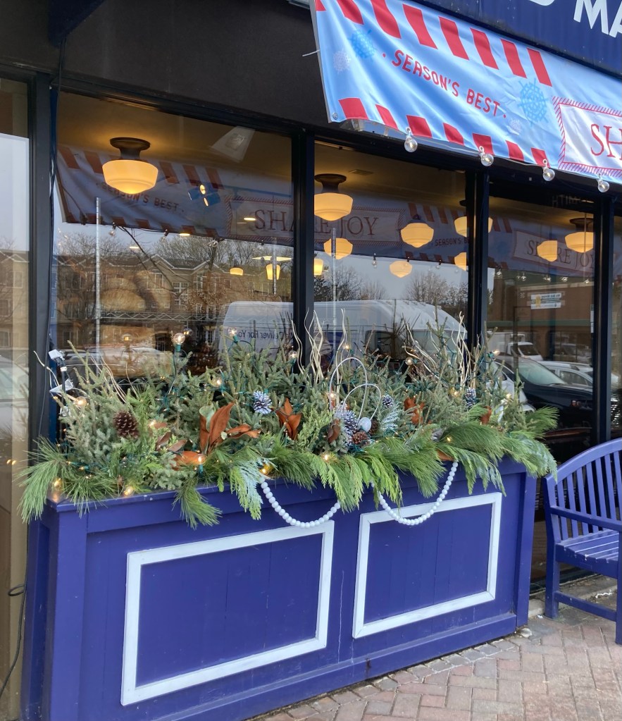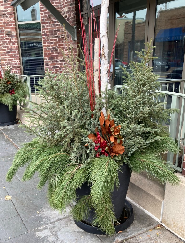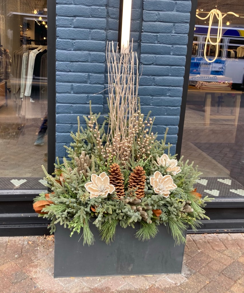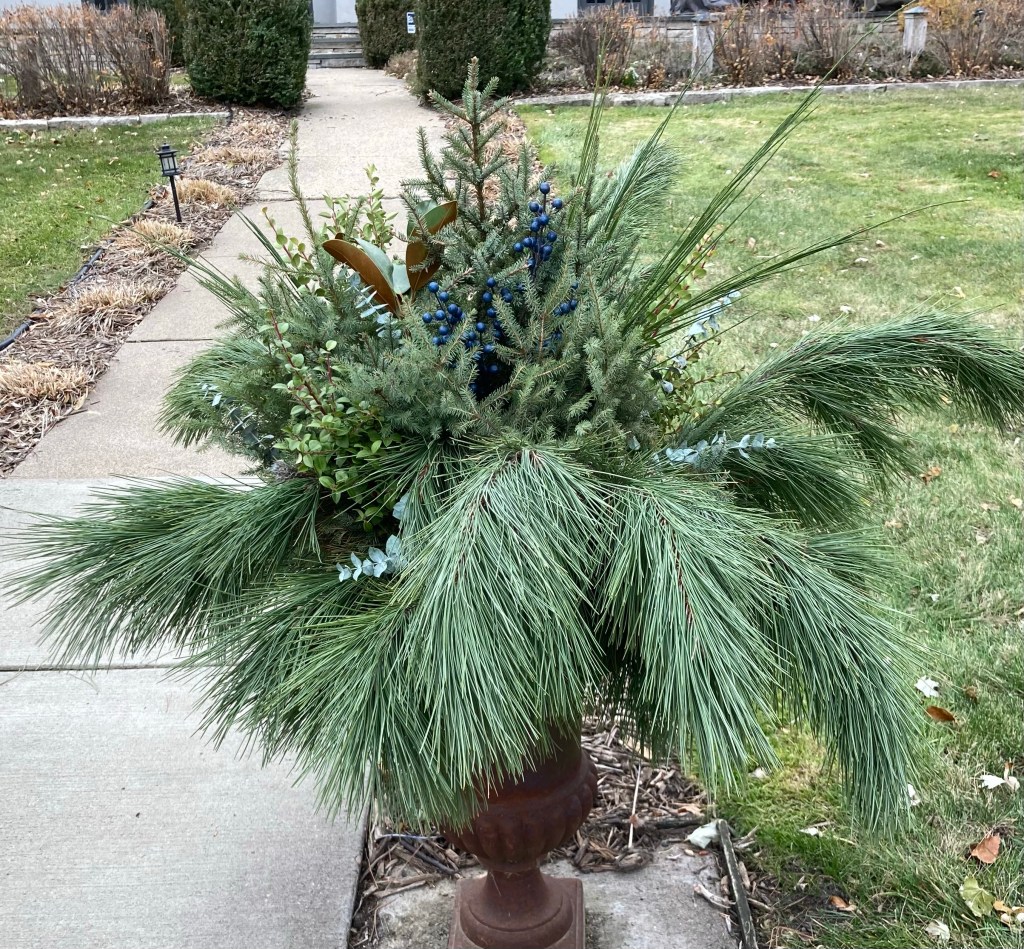One of nice amenities for where we are staying are the number of pedestrian overpasses over the highway that divides “our” side of Edina from the other side. Today’s walk took us over one of these overpasses. One of the sites we are noticing in the neighborhoods and retail areas are the lovely evergreen based arrangements.