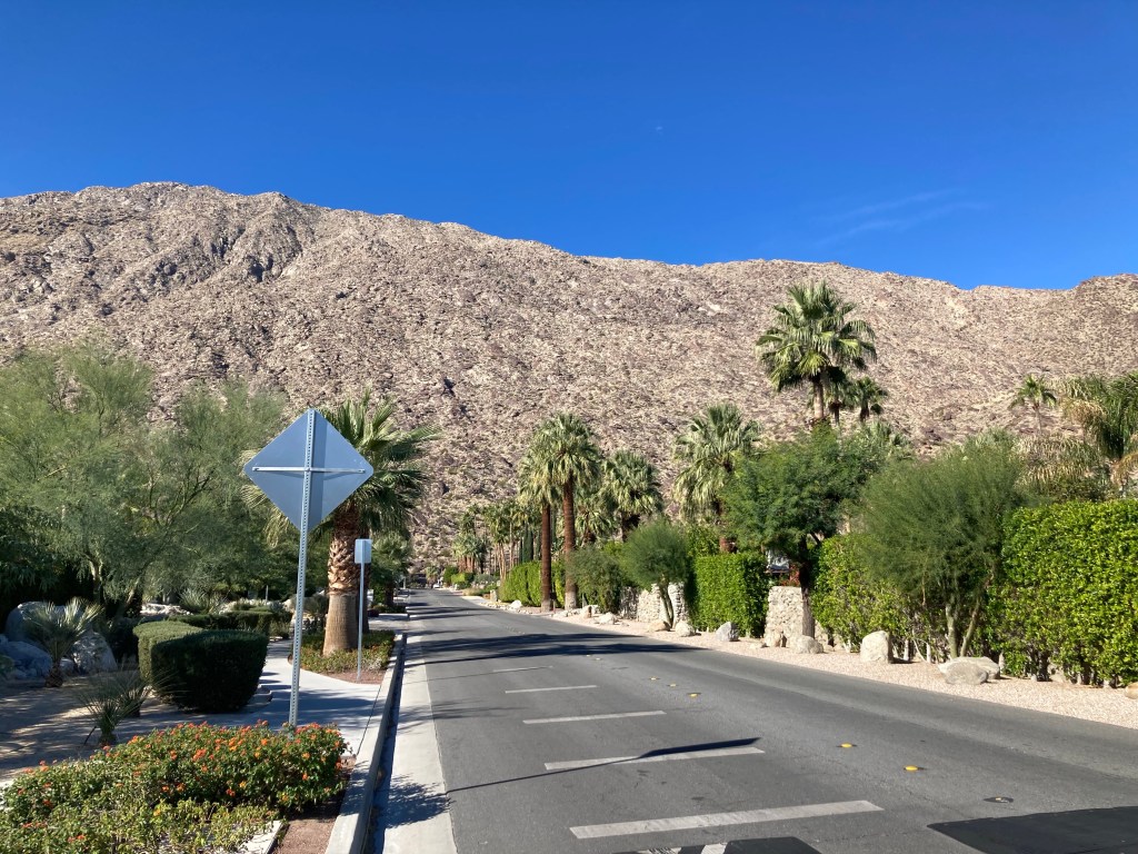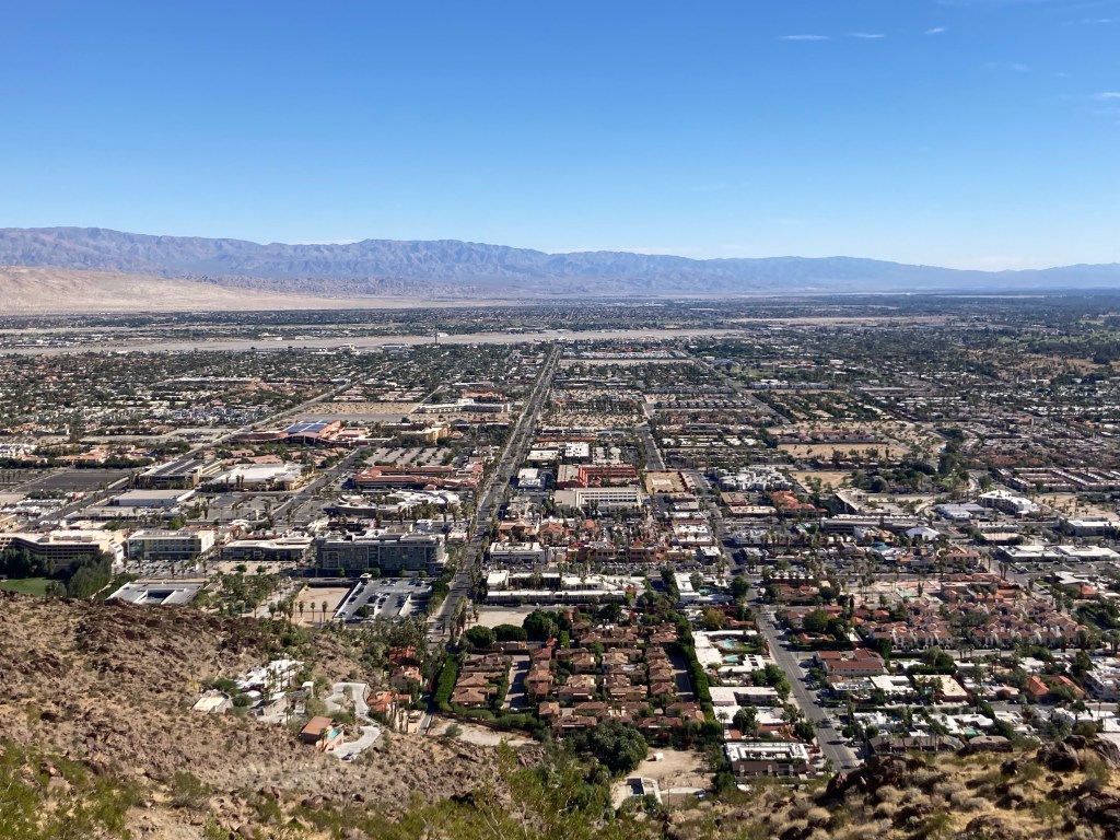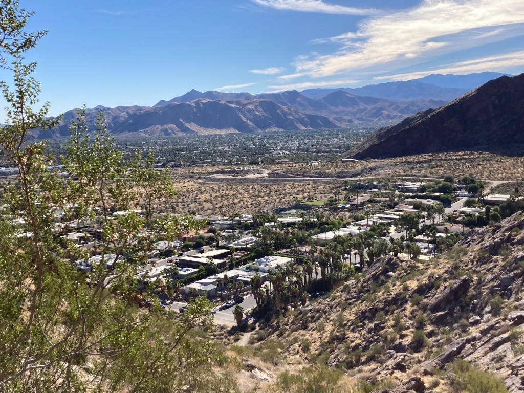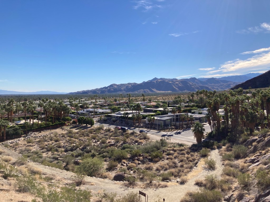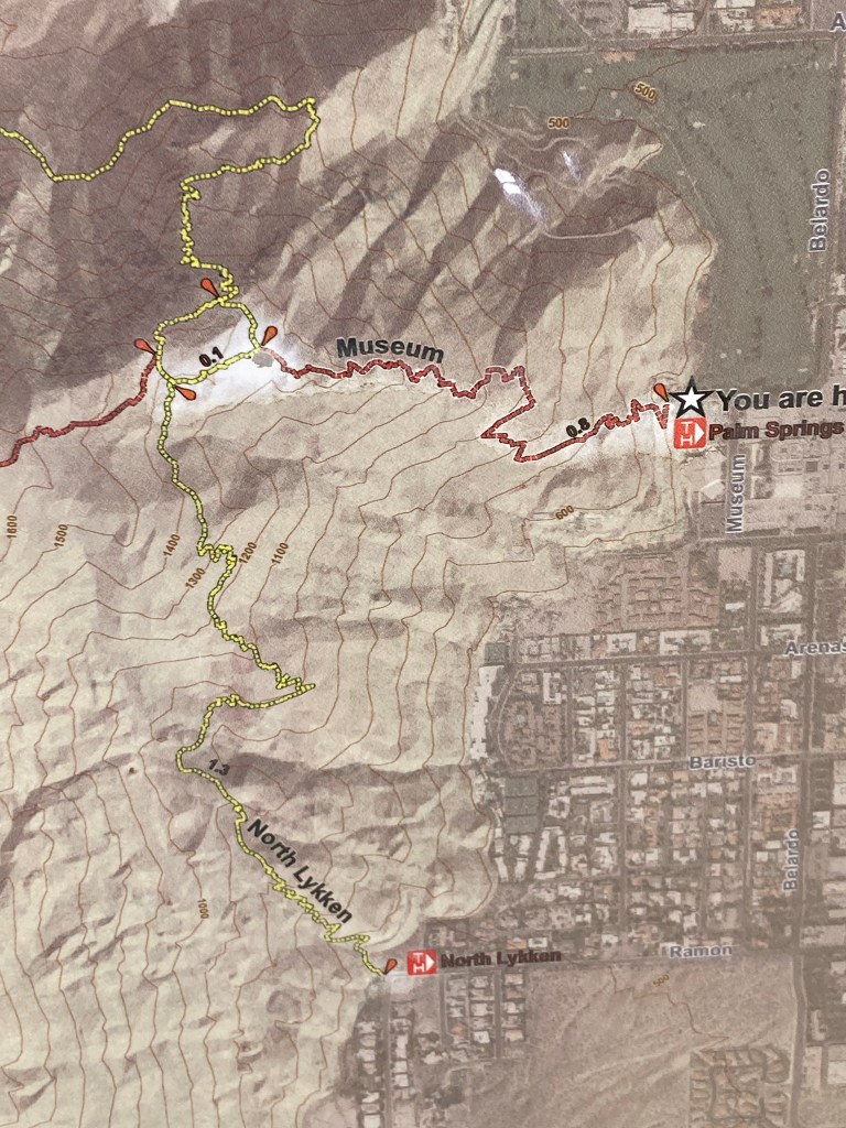 View from KoffiWalking to the trailheadMap of the North Lykken and Museum Trails. I did not get a photo of the elevation gains.First view of a Palm Springs neighborhood as we begin our ascent Up we goA higher view of the surrounding areaAnother peak as we move between mountains Awesome!Desert floraHeading back downAnother perspective Getting closerBack down. This is a sign by our condo. Never seen this before. Google isn’t much help with this, may need to pester a local.