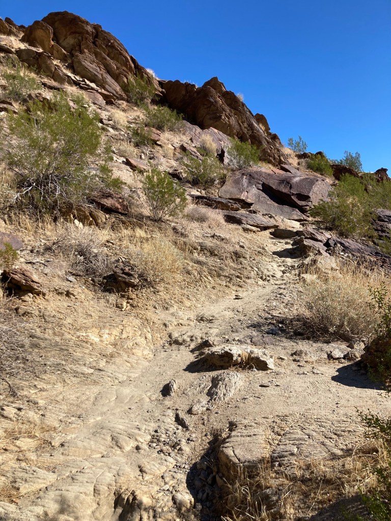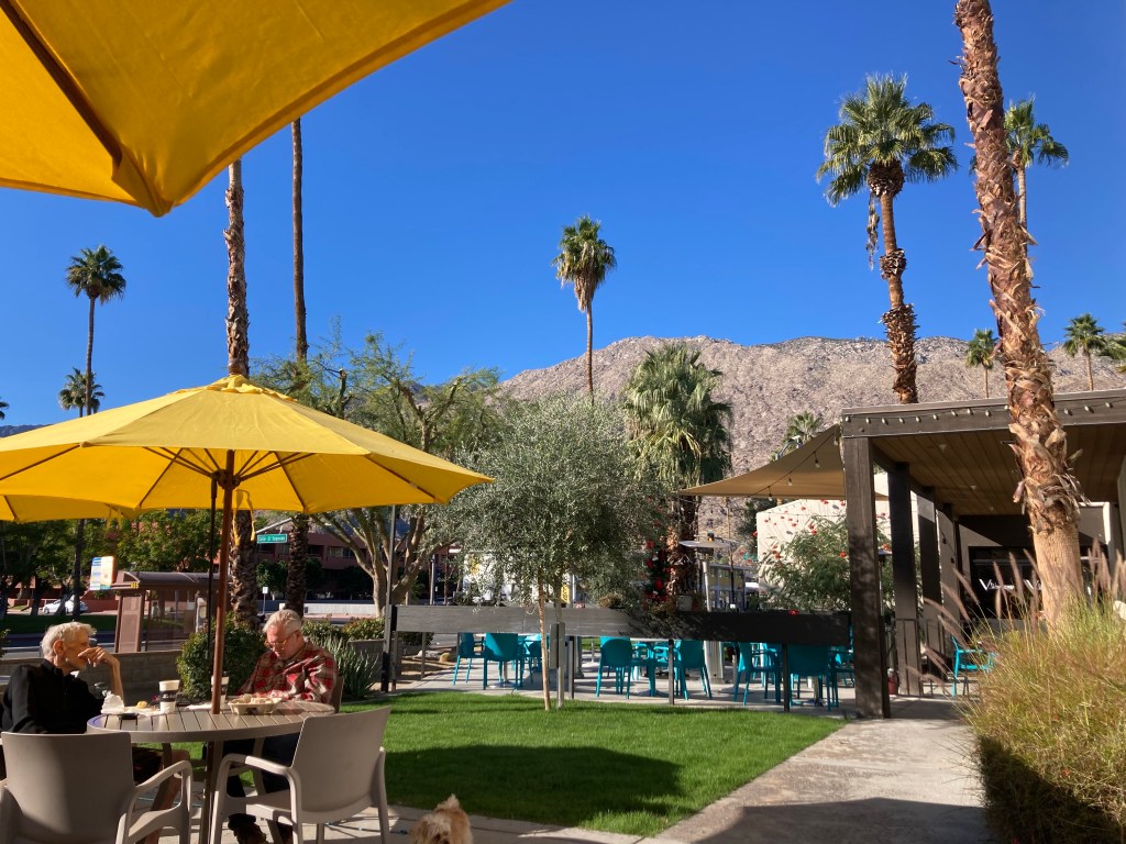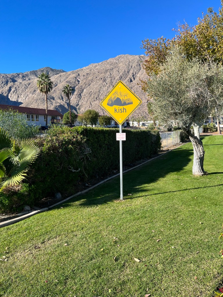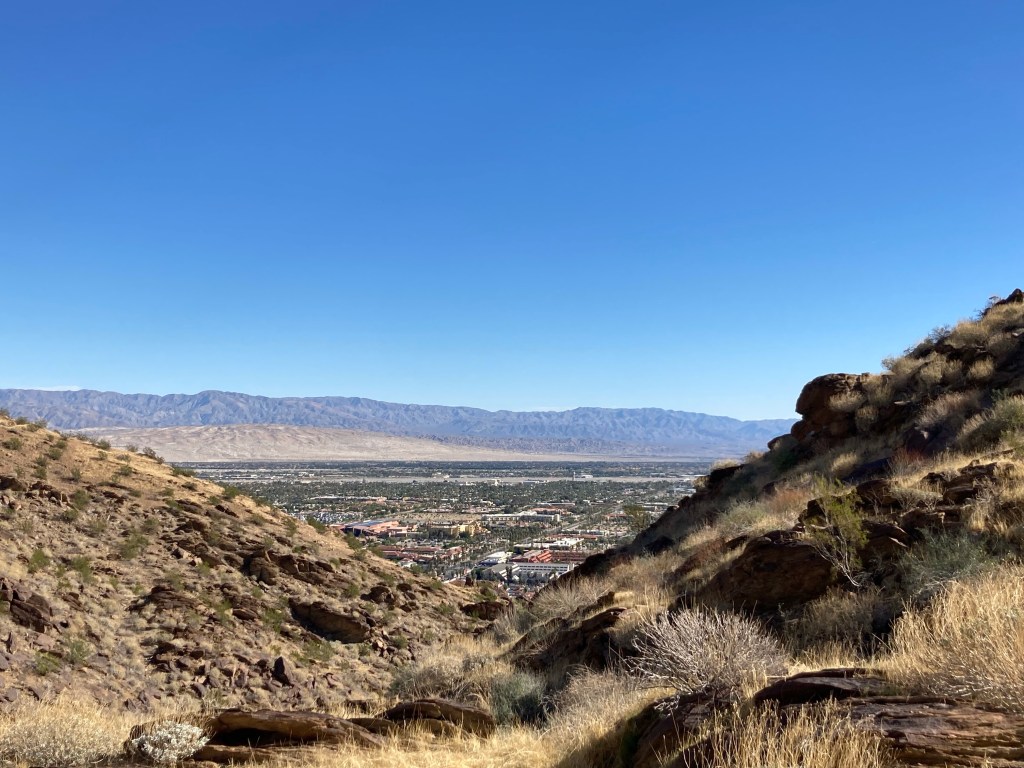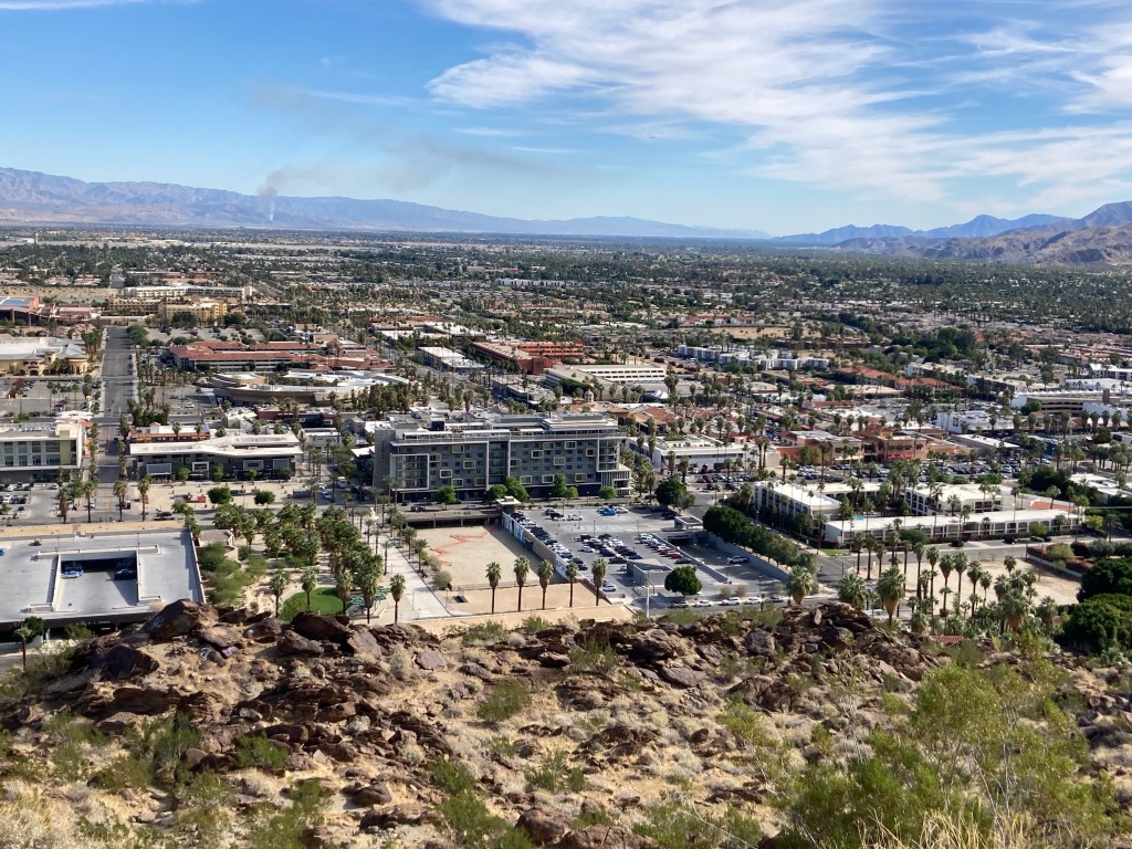 View from KoffiWalking to the trailheadMap of the North Lykken and Museum Trails. I did not get a photo of the elevation gains.First view of a Palm Springs neighborhood as we begin our ascent Up we goA higher view of the surrounding areaAnother peak as we move between mountains Awesome!Desert floraHeading back downAnother perspective Getting closerBack down. This is a sign by our condo. Never seen this before. Google isn’t much help with this, may need to pester a local.
